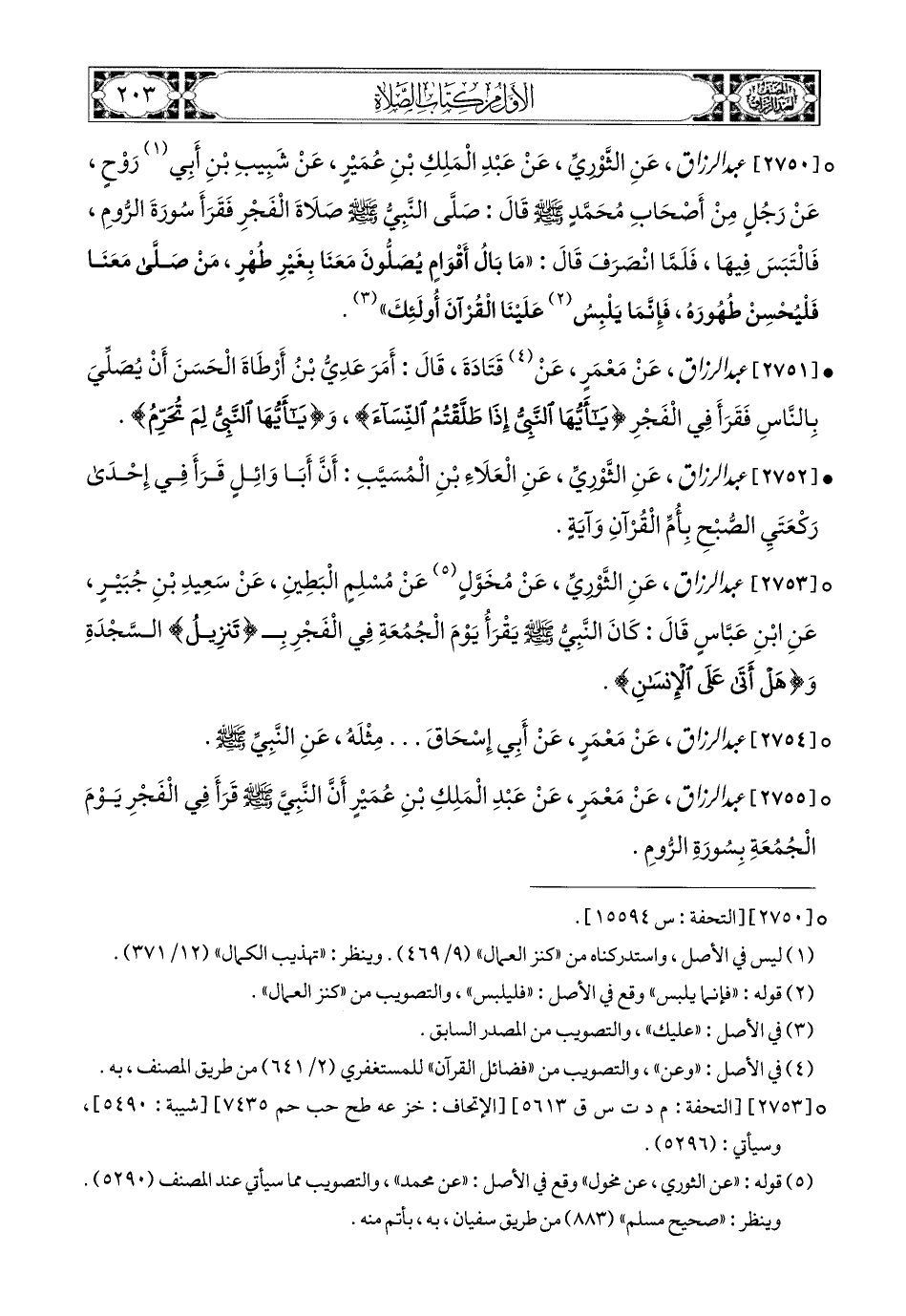 2750- عبد الرزاق، عَنِ الثَّورِيِّ، عَنْ عَبدِ المَلِكِ بْنِ عُمَيْرٍ، عَن شَبِيبِ بْنِ أَبِي رَوْحٍ، عَن رَجُلٍ مِنْ أَصْحَابِ مُحَمَّدٍ صَلَّى اللهُ عَلَيْهِ وَسَلَّمَ، قَالَ: صَلَّى النَّبِيُّ صَلَّى اللهُ عَلَيْهِ وَسَلَّمَ صَلاَةَ الْفَجْرِ، فَقَرَأَ سُورَةَ الرُّومِ، فَالْتَبَسَ فِيهَا، فَلَمَّا انْصَرَفَ قَالَ: مَا بَالُ أَقْوَامٍ يُصَلُّونَ مَعَنْا بِغَيْرِ طُهْرٍ، مَنْ صَلَّى مَعَنْا، فَلْيُحْسِنْ طُهُورَهُ، فَإِنَّمَا يَلْبِسُ عَلَيْنَا الْقُرْآنَ أُولَئِكَ.