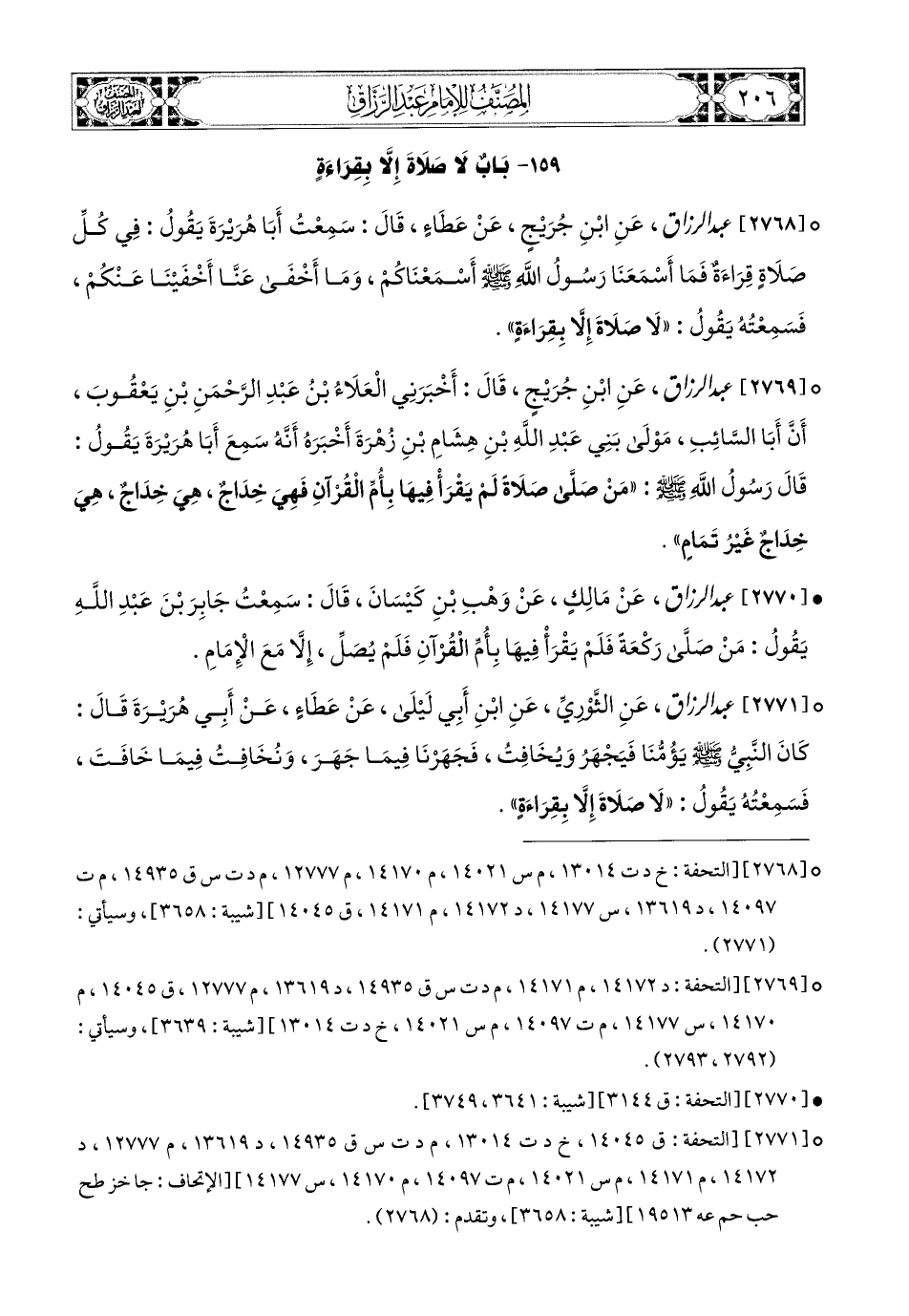 2770- عبد الرزاق، عَنْ مَالِكٍ، عَن وَهْبِ بْنِ كَيْسَانَ، قَالَ: سَمِعْتُ جَابِرَ بن عَبدِ اللهِ يَقُولُ: مَنْ صَلَّى رَكْعَةً فَلَمْ يَقْرَأْ فِيهَا بِأُمِّ الْقُرْآنِ، فَلَمْ يُصَلِّ، إِلاَّ مَعَ الإِمَامِ.