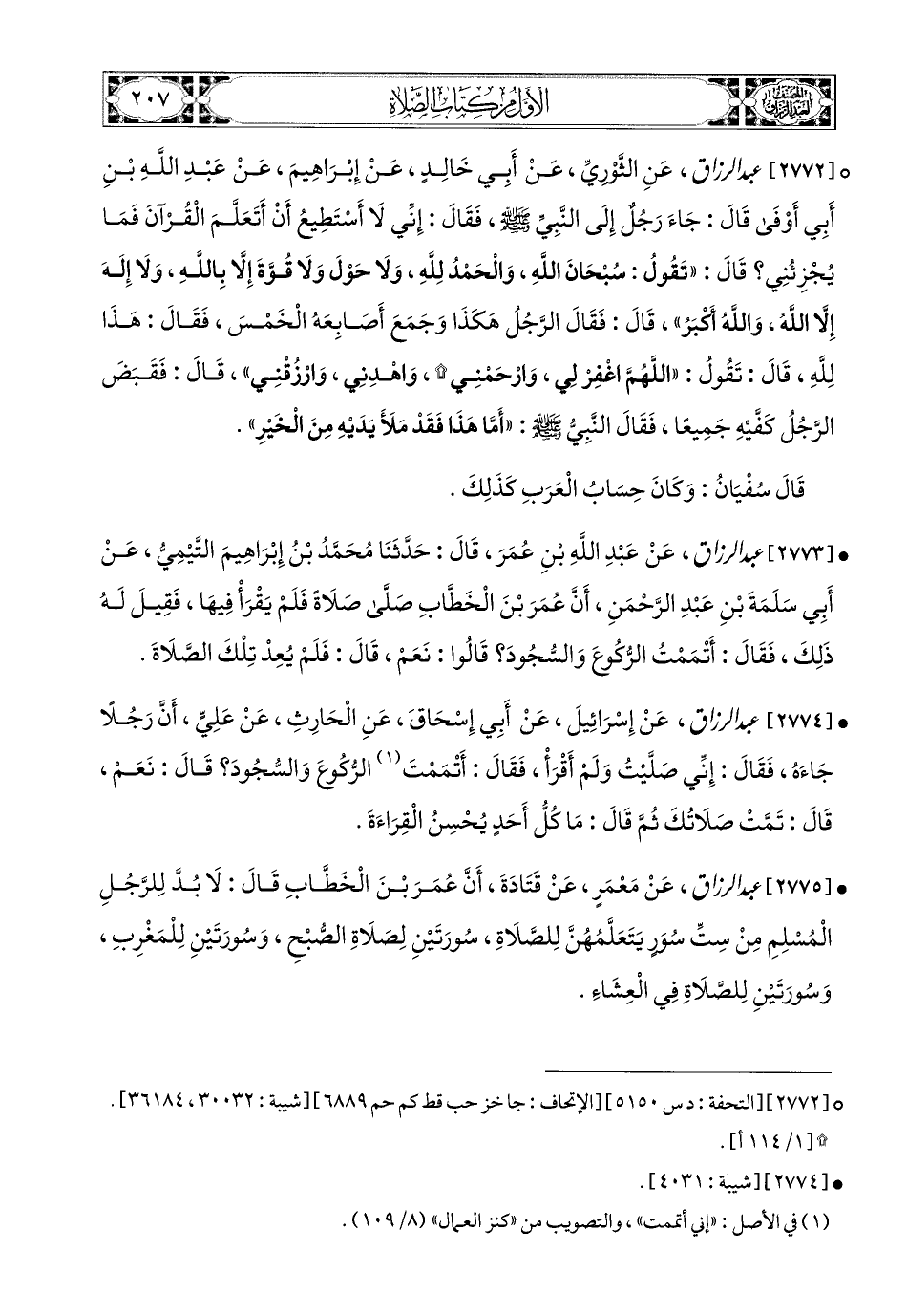 2772- عبد الرزاق، عَنِ الثَّورِيِّ، عَنْ أَبِي خَالِدٍ، عَن إِبرَاهِيمَ، عَنْ عَبدِ اللهِ بْنِ أَبِي أَوْفَى، قَالَ: جَاءَ رَجُلٌ إِلَى النَّبِيِّ صَلَّى اللهُ عَلَيْهِ وَسَلَّمَ، فَقَالَ: إِنِّي لاَ أَسْتَطِيعُ أَنْ أَتَعَلَّمَ الْقُرْآنَ، فَمَا يُجْزِئُنِي؟ قَالَ: تَقُولُ: سُبْحَانَ اللهِ، وَالْحَمْدُ للهِ، وَلاَ حَوْلَ وَلاَ قُوَّةَ إِلاَّ باللهِ، وَلاَ إِلَهَ إِلاَّ اللهُ، وَاللهُ أَكْبَرُ، قَالَ: فَقَالَ الرَّجُلُ هَكَذَا، وَجَمَعَ أَصَابِعَهُ الْخَمْسَ، فَقَالَ: هَذَا للهِ، قَالَ: تَقُولُ: اللهُمَّ اغْفِرْ لِي، وَارْحَمْنِي، وَاهْدِنِي، وَارْزُقْنِي، قَالَ: فَقَبَضَ الرَّجُلُ كَفَّيْهِ جَمِيعًا، فَقَالَ النَّبِيُّ صَلَّى اللهُ عَلَيْهِ وَسَلَّمَ: أَمَّا هَذَا فَقَدْ مَلأَ يَدَيْهِ مِنَ الْخَيْرِ.