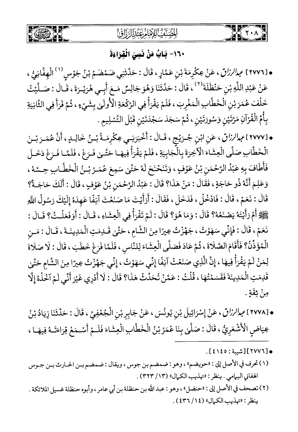 2777- عبد الرزاق، عَنِ ابْنِ جُرَيْجٍ، قَالَ: أَخْبَرَنِي عِكْرِمَةُ بنُ خَالِدٍ، أَنَّ عُمَرَ بن الْخَطَّابِ صَلَّى الْعِشَاءَ الآخِرَةَ بِالْجَابِيَةِ، فَلَمْ يَقْرَأْ فِيهَا حَتَّى فَرَغَ، فَلَمَّا فَرَغَ دَخَلَ، فَأَطَافَ بِهِ عَبدُ الرَّحْمَنِ بن عَوْفٍ، وَتَنَحْنَحَ لَهُ، حَتَّى سَمِعَ عُمَرُ بن الْخَطَّابِ حِسَّهُ، وَعَلِمَ أَنَّهُ ذُو حَاجَةٍ، فَقَالَ: مَنْ هَذَا؟ قَالَ: عَبدُ الرَّحْمَنِ بن عَوْفٍ، قَالَ: أَلَكَ حَاجَةٌ؟ قَالَ: نَعَمْ، قَالَ: فَادْخُلْ، فَدَخَلَ، فَقَالَ: أَرَأَيْتَ مَا صَنَعْتَ آنِفًا، عَهِدَهُ إِلَيْكَ رَسُولُ اللهِ صَلَّى اللهُ عَلَيْهِ وَسَلَّمَ أَمْ رَأَيْتَهُ يَصْنَعُهُ؟ قَالَ: وَمَا هُوَ؟ قَالَ: لَمْ تَقْرَأْ فِي الْعِشَاءِ، قَالَ: أَوَفَعَلْتُ؟ قَالَ: نَعَمْ، قَالَ: فَإِنِّي سَهَوْتُ، جَهَّزْتُ عِيرًا مِنَ الشَّامِ، حَتَّى قَدِمَتِ المَدِينَةَ، قَالَ: مَنِ المُؤَذِّنُ؟ فَأَقَامَ الصَّلاَةَ، ثُمَّ عَادَ فَصَلَّى الْعِشَاءَ لِلنَّاسِ، فَلَمَّا فَرَغَ خَطَبَ، قَالَ: لاَ صَلاَةَ لِمَنْ لَمْ يَقْرَأْ فِيهَا، إِنَّ الَّذِي صَنَعْتُ آنِفًا إِنِّي سَهَوْتُ، إِنِّي جَهَّزْتُ عِيرًا مِنَ الشَّامِ، حَتَّى قَدِمَتِ المَدِينَةَ، فَقَسَّمْتُهَا، قُلْتُ: عَمَّنْ تُحَدِّثُ هَذَا؟ قَالَ: لاَ أَدْرِي، غَيْرَ أَنِّي لَمْ آخُذْهُ إِلاَّ مِنْ ثِقَةٍ.
