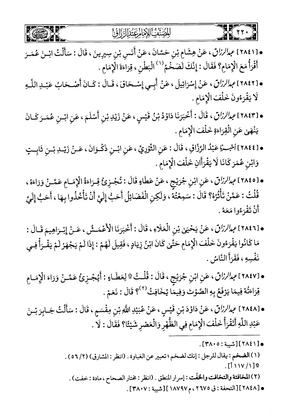 2843- عبد الرزاق، أَخْبَرَنَا دَاوُدُ بن قَيْسٍ، عَن زَيْدِ بْنِ أَسْلَمَ، عَنِ ابْنِ عُمَرَ كَانَ يَنْهَى عَنِ الْقِرَاءَةِ خَلْفَ الإِمَامِ.