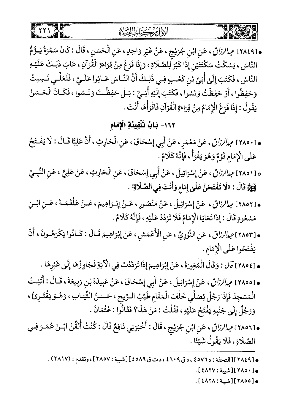 2853- عبد الرزاق، عَنِ الثَّورِيِّ، عَنِ الأَعمَشِ، عَن إِبرَاهِيمَ، قَالَ: كَانُوا يَكْرَهُونَ أَنْ يَفْتَحُوا عَلَى الإِمَامِ.