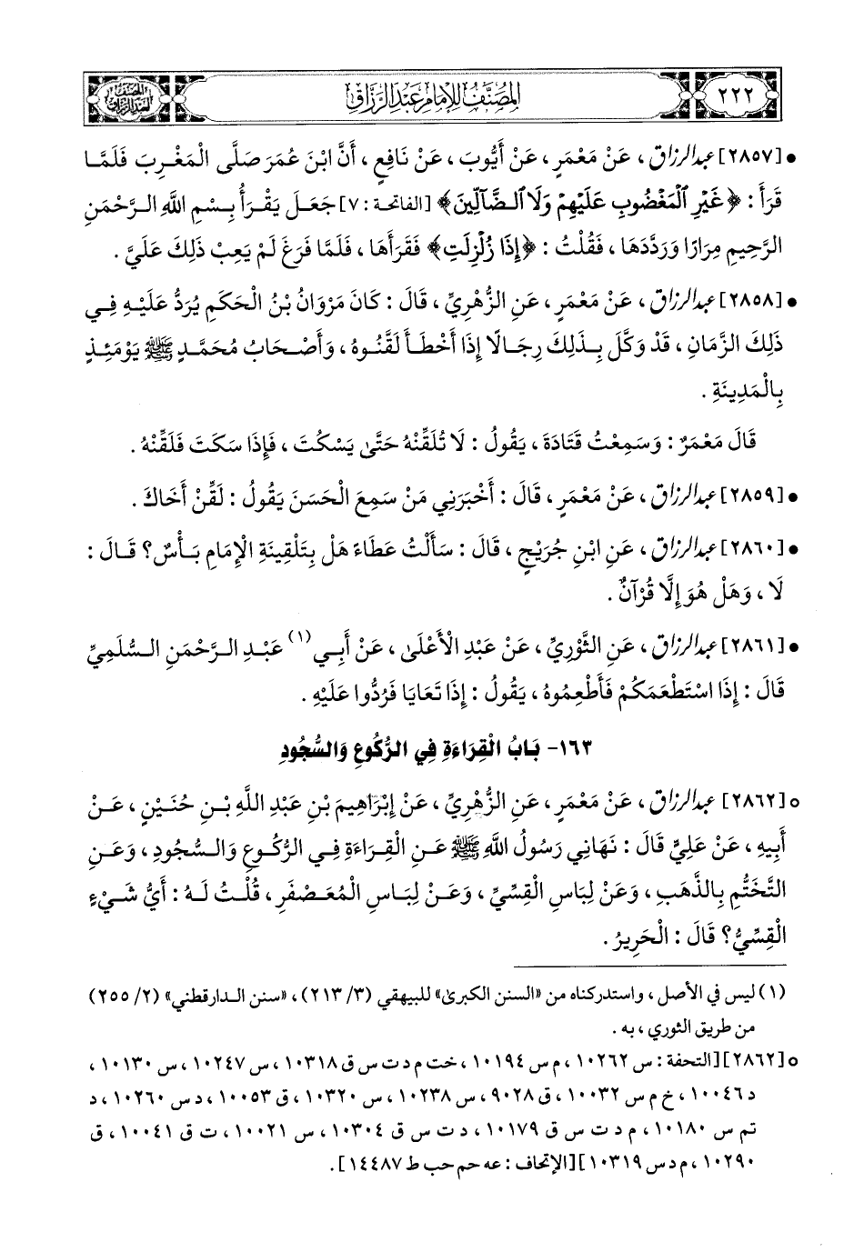 2862- عبد الرزاق، عَنْ مَعْمَرٍ، عَنِ الزُّهْرِيِّ، عَن إِبرَاهِيمَ بْنِ عَبدِ اللهِ بْنِ حُنَيْنٍ، عَنْ أَبِيهِ، عَنْ عَلِيٍّ، قَالَ: نَهَانِي رَسُولُ اللهِ صَلَّى اللهُ عَلَيْهِ وَسَلَّمَ عَنِ الْقِرَاءَةِ فِي الرُّكُوعِ وَالسُّجُودِ، وَعَنِ التَّخَتُّمِ بِالذَّهَبِ، وَعَنْ لِبَاسِ الْقَسِّيِّ، وَعَنْ لِبَاسِ المُعَصْفَرِ.