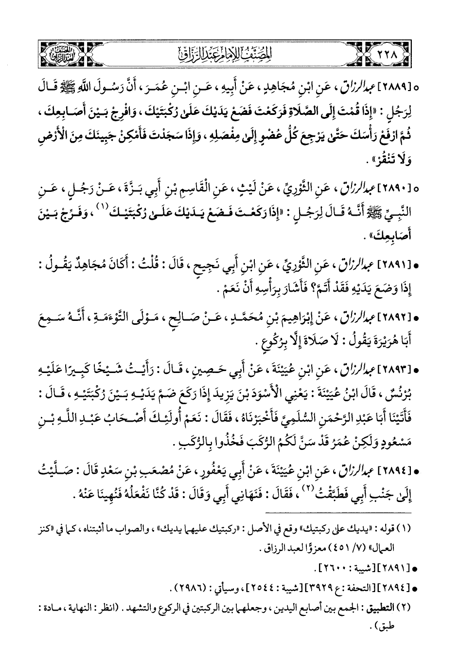 2894- عبد الرزاق، عَنِ ابْنِ عُيَيْنَةَ، عَنْ أَبِي يَعْفُورٍ، عَن مُصْعَبِ بْنِ سَعْدٍ قَالَ: صَلَّيْتُ إِلَى جَنْبِ أَبِي، فَطَبَّقْتُ، فَقَالَ: فَنَهَانِي أَبِي، وَقَالَ: قَدْ كُنَّا نَفْعَلُهُ فَنُهِينَا عَنْهُ.