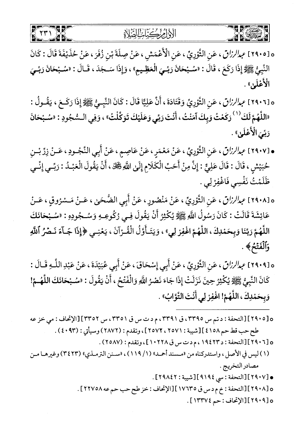2905 - عبد الرزاق، عَنِ الثَّورِيِّ، عَنِ الأَعمَشِ، [عَنْ سَعْدِ بْنِ عُبَيْدَةَ] (1)، عَن صِلَةَ بْنِ زُفَرَ، عَن حُذَيْفَةَ قَالَ: كَانَ النَّبِيُّ صَلَّى اللهُ عَلَيْهِ وَسَلَّمَ إِذَا رَكَعَ قَالَ: سُبْحَانَ رَبِّيَ الْعَظِيمِ، وَإِذَا سَجَدَ قَالَ: سُبْحَانَ رَبِّيَ الأَعْلَى.