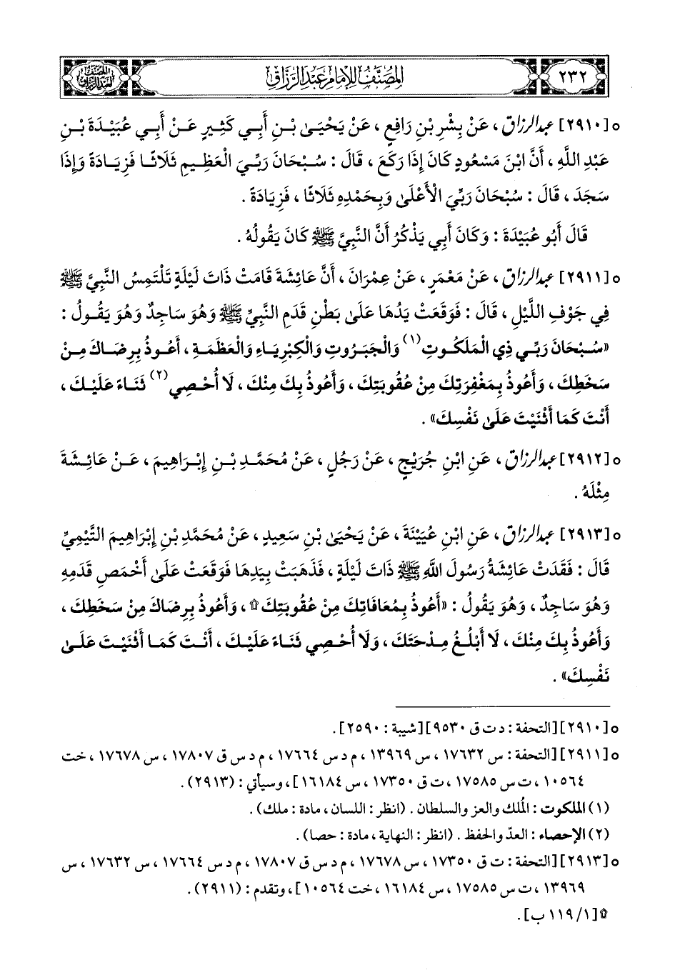 2911- عبد الرزاق، عَنْ مَعْمَرٍ، عَنْ عِمْرَانَ، أَنَّ عَائِشَةَ قَامَتْ ذَاتَ لَيْلَةٍ تَلْتَمِسُ النَّبِيَّ صَلَّى اللهُ عَلَيْهِ وَسَلَّمَ فِي جَوْفِ اللَّيْلِ، قَالَ: فَوَقَعَتْ يَدُهَا عَلَى بَطْنِ قَدَمِ النَّبِيِّ صَلَّى اللهُ عَلَيْهِ وَسَلَّمَ وَهُوَ سَاجِدٌ، وَهُوَ يَقُولُ: سُبْحَانَ رَبِّي ذِي المَلَكُوتِ وَالْجَبَرُوتِ وَالْكِبْرِيَاءِ وَالْعَظَمَةِ، أَعُوذُ بِرِضَاكَ مِنْ سَخَطِكَ، وَأَعُوذُ بِمَغْفِرَتِكَ مِنْ عُقُوبَتِكَ، وَأَعُوذُ بِكَ مِنْكَ، لاَ أُحْصِي ثَنَاءً عَلَيْكَ، أَنْتَ كَمَا أَثْنَيْتَ عَلَى نَفْسِكَ.