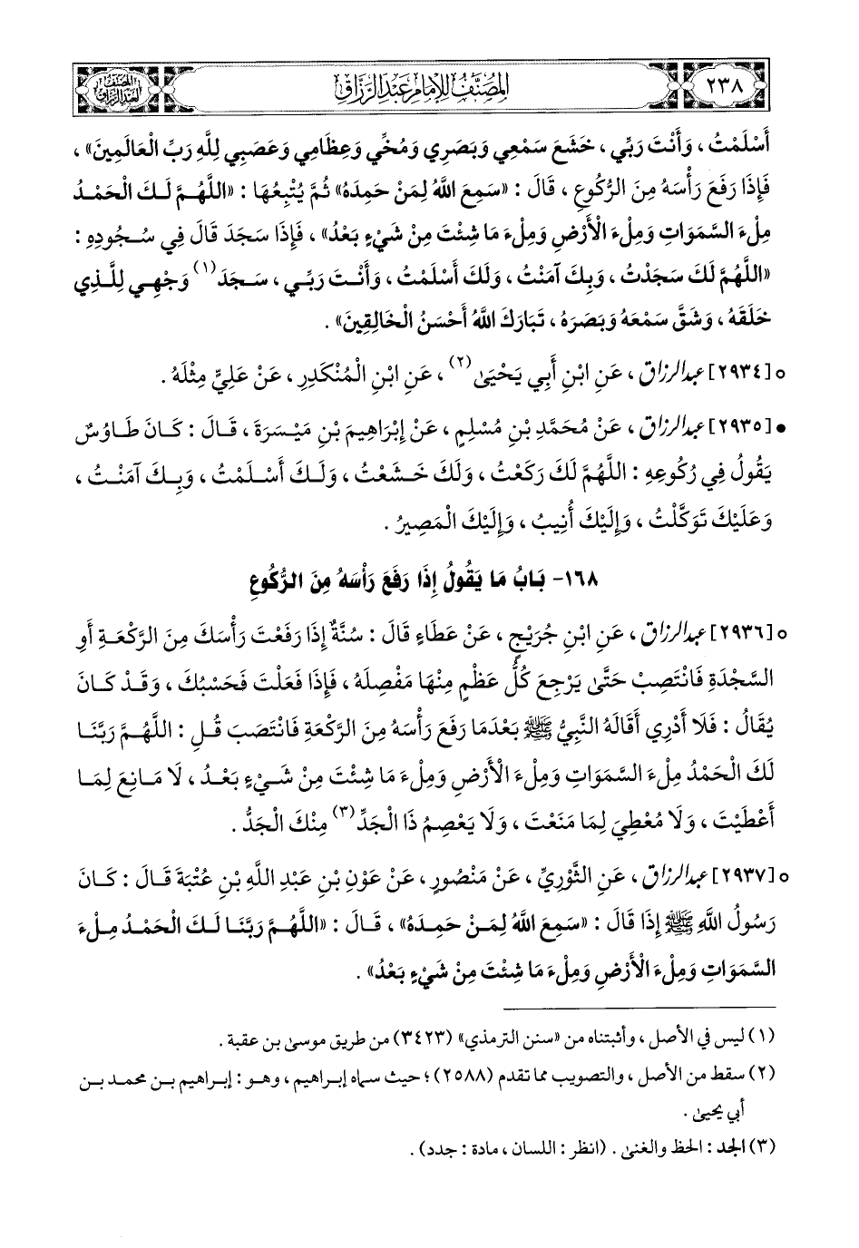 2937- عبد الرزاق، عَنِ الثَّورِيِّ، عَنْ مَنصُورٍ، عَنْ عَوْنِ بْنِ عَبدِ اللهِ بْنِ عُتْبَةَ قَالَ: كَانَ رَسُولُ اللهِ صَلَّى اللهُ عَلَيْهِ وَسَلَّمَ إِذَا قَالَ سَمِعَ اللهُ لِمَنْ حَمِدَهُ قَالَ: اللهُمَّ رَبَّنَا لَكَ الْحَمْدُ مِلْءَ السَّمَاوَاتِ وَمِلْءَ الأَرْضِ وَمِلْءَ مَا شِئْتَ مِنْ شَيْءٍ بَعْدُ.