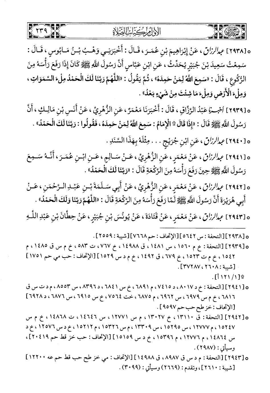 2941- عبد الرزاق، عَنْ مَعْمَرٍ، عَنِ الزُّهْرِيِّ، عَن سَالِمٍ، عَنِ ابْنِ عُمَرَ، أَنَّهُ سَمِعَ رَسُولَ اللهِ صَلَّى اللهُ عَلَيْهِ وَسَلَّمَ حِينَ رَفَعَ رَأْسَهُ مِنَ الرَّكْعَةِ قَالَ: رَبَّنَا لَكَ الْحَمْدُ.