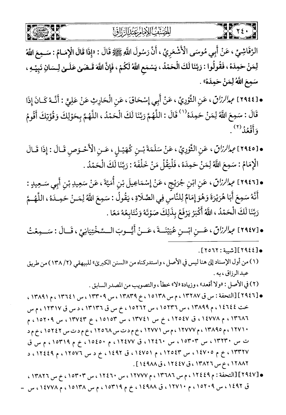2947- عبد الرزاق، عَنِ ابْنِ عُيَيْنَةَ، عَنْ أَيُّوبَ السَّخْتِيَانِيِّ، قَالَ: سَمِعْتُ عَبدَ الرَّحْمَنِ بن هُرْمُزَ الأَعْرَجَ يَقُولُ: سَمِعْتُ أَبَا هُرَيرَةَ يَقُولُ: إِذَا رَفَعَ الإِمَامُ رَأْسَهُ مِنَ الرُّكُوعِ فَقَالَ: سَمِعَ اللهُ لِمَنْ حَمِدَهُ، فَقُلْ: رَبَّنَا لَكَ الْحَمْدُ.