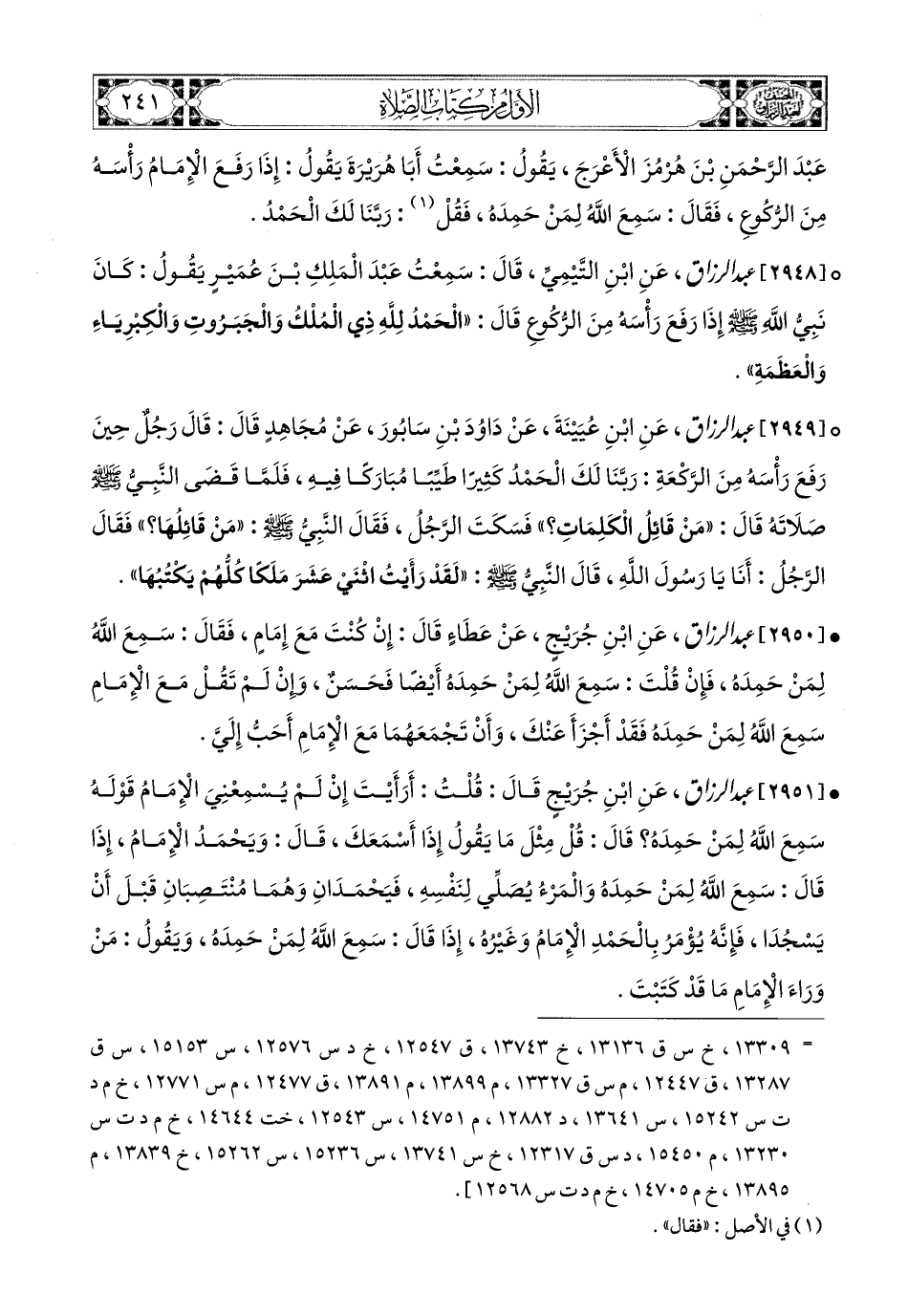 2949- عبد الرزاق، عَنِ ابْنِ عُيَيْنَةَ، عَن دَاوُدَ بْنِ سَابُورَ، عَن مُجاهِدٍ قَالَ: قَالَ رَجُلٌ حِينَ رَفَعَ رَأْسَهُ مِنَ الرَّكْعَةِ: رَبَّنَا لَكَ الْحَمْدُ كَثِيرًا طَيِّبًا مُبَارَكًا فِيهِ، فَلَمَّا قَضَى النَّبِيُّ صَلَّى اللهُ عَلَيْهِ وَسَلَّمَ صَلاَتَهُ قَالَ: مَنْ قَائِلُ الْكَلِمَاتِ؟ فَسَكَتَ الرَّجُلُ، فَقَالَ النَّبِيُّ صَلَّى اللهُ عَلَيْهِ وَسَلَّمَ: مَنْ قَائِلُهَا؟ فَقَالَ الرَّجُلُ: أَنَا يَا رَسُولَ اللهِ، قَالَ النَّبِيُّ صَلَّى اللهُ عَلَيْهِ وَسَلَّمَ: لَقَدْ رَأَيْتُ اثْنَى عَشَرَ مَلَكًا كُلُّهُمْ يَكْتُبُهَا.