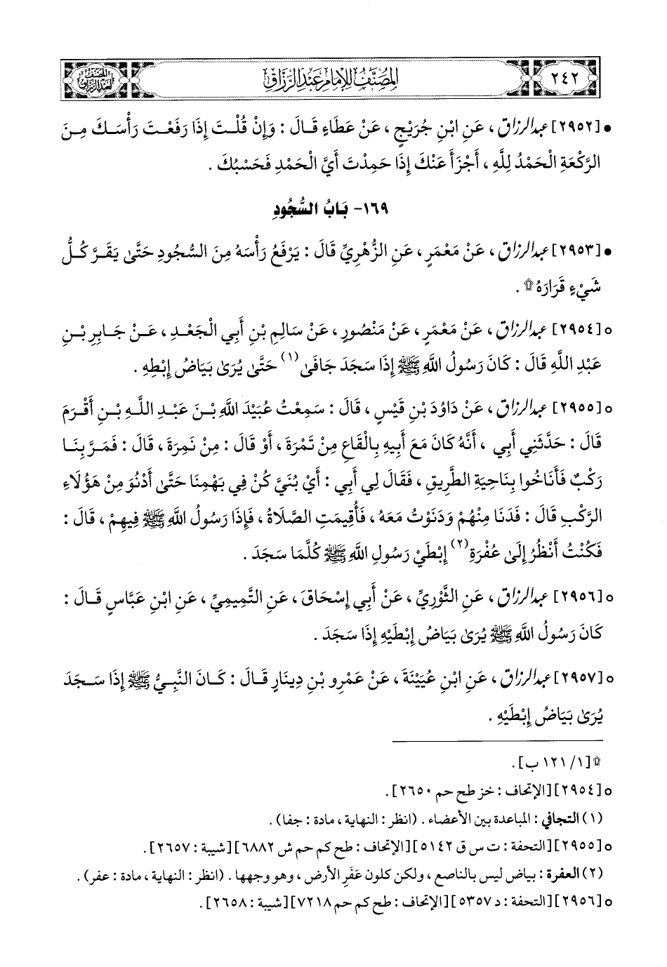 2957- عبد الرزاق، عَنِ ابْنِ عُيَيْنَةَ، عَنْ عَمْرِو بنِ دِينَارٍ قَالَ: كَانَ النَّبِيُّ صَلَّى اللهُ عَلَيْهِ وَسَلَّمَ إِذَا سَجَدَ يُرَى بَيَاضُ إِبْطَيْهَ.