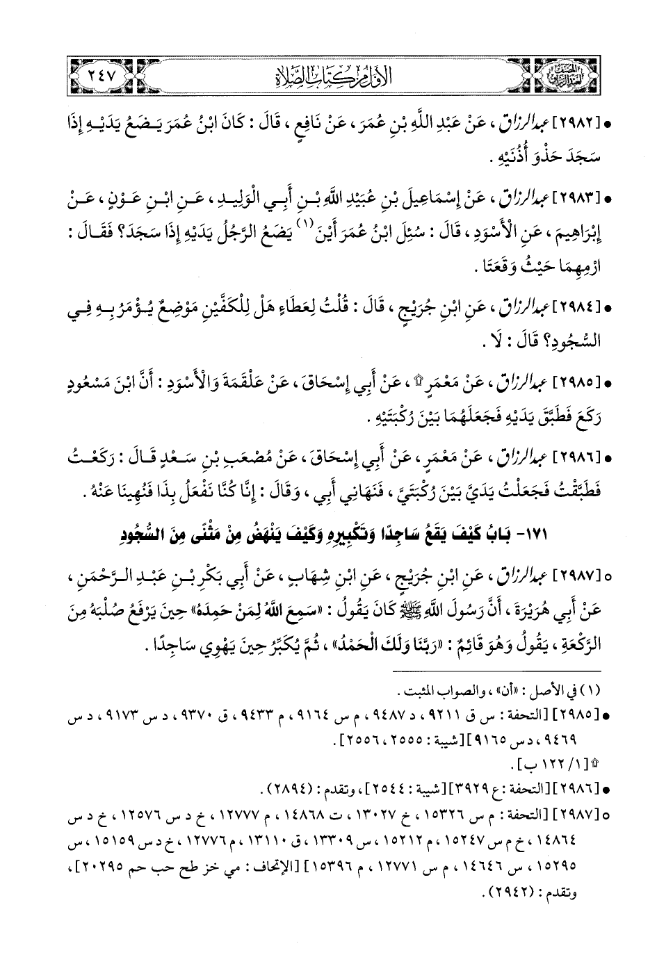 2982- عبد الرزاق، عَنْ عَبدِ اللهِ بْنِ عُمَرَ، عَن نَافِعٍ، قَالَ: كَانَ ابْنُ عُمَرَ يَضَعُ يَدَيْهِ إِذَا سَجَدَ حَذْوَ أُذُنَيْهِ.