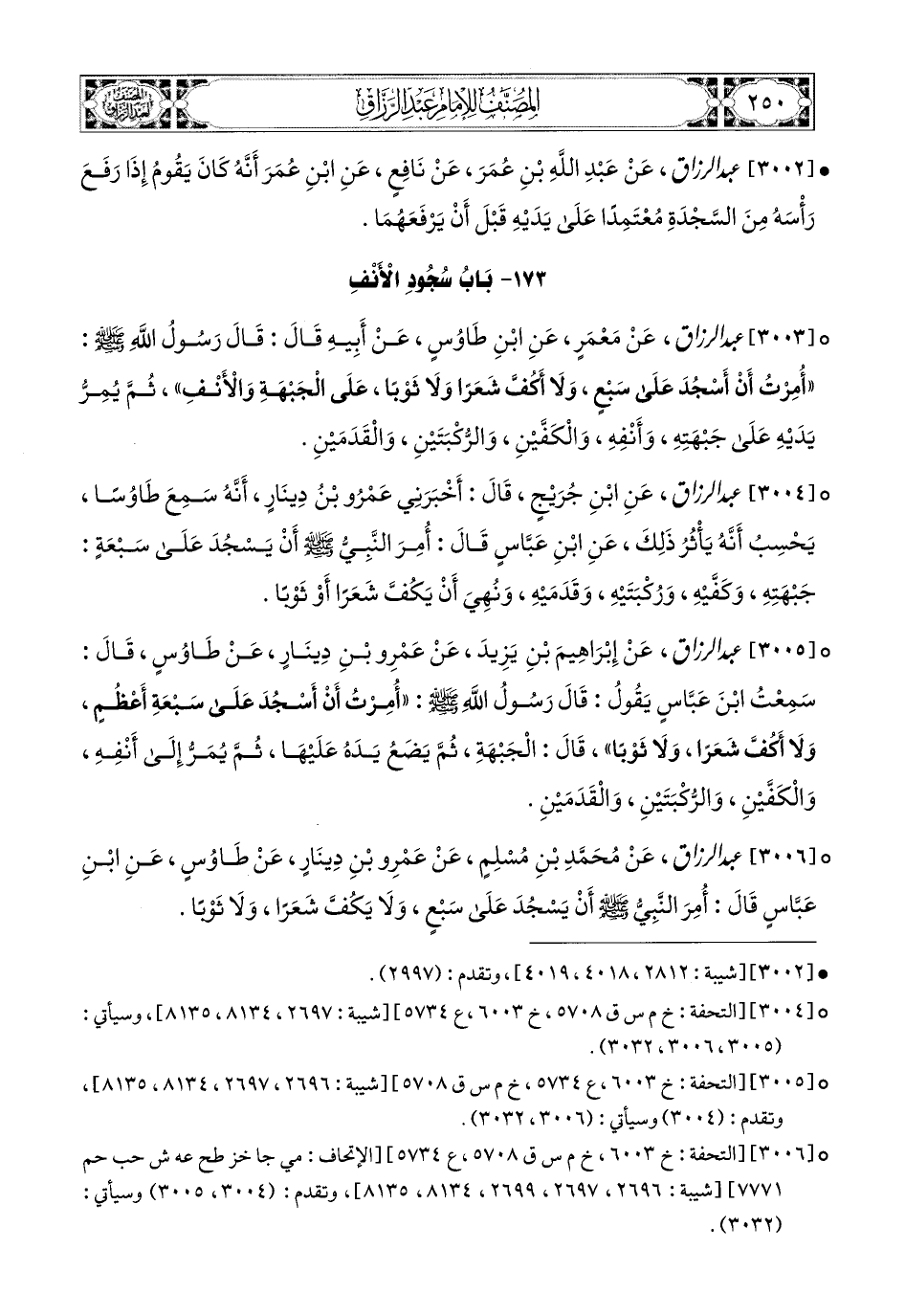 3005- عبد الرزاق، عَن إِبرَاهِيمَ بْنِ يَزِيدَ، عَنْ عَمْرِو بنِ دِينَارٍ، عَن طَاوُوسٍ، قَالَ: سَمِعْتُ ابْنَ عَبَّاسٍ يَقُولُ: قَالَ رَسُولُ اللهِ صَلَّى اللهُ عَلَيْهِ وَسَلَّمَ: أُمِرْتُ أَنْ أَسْجُدَ عَلَى سَبْعَةِ أَعْظُمٍ، وَلاَ أَكُفَّ شَعَرًا، وَلاَ ثَوْبًا، قَالَ: الْجَبْهَةِ، ثُمَّ يَضَعُ يَدَهُ عَلَيْهَا، ثُمَّ يُمِرُّ إِلَى أَنْفِهِ، وَالْكَفَّيْنِ، وَالرُّكْبَتَيْنِ، وَالْقَدَمَيْنِ.