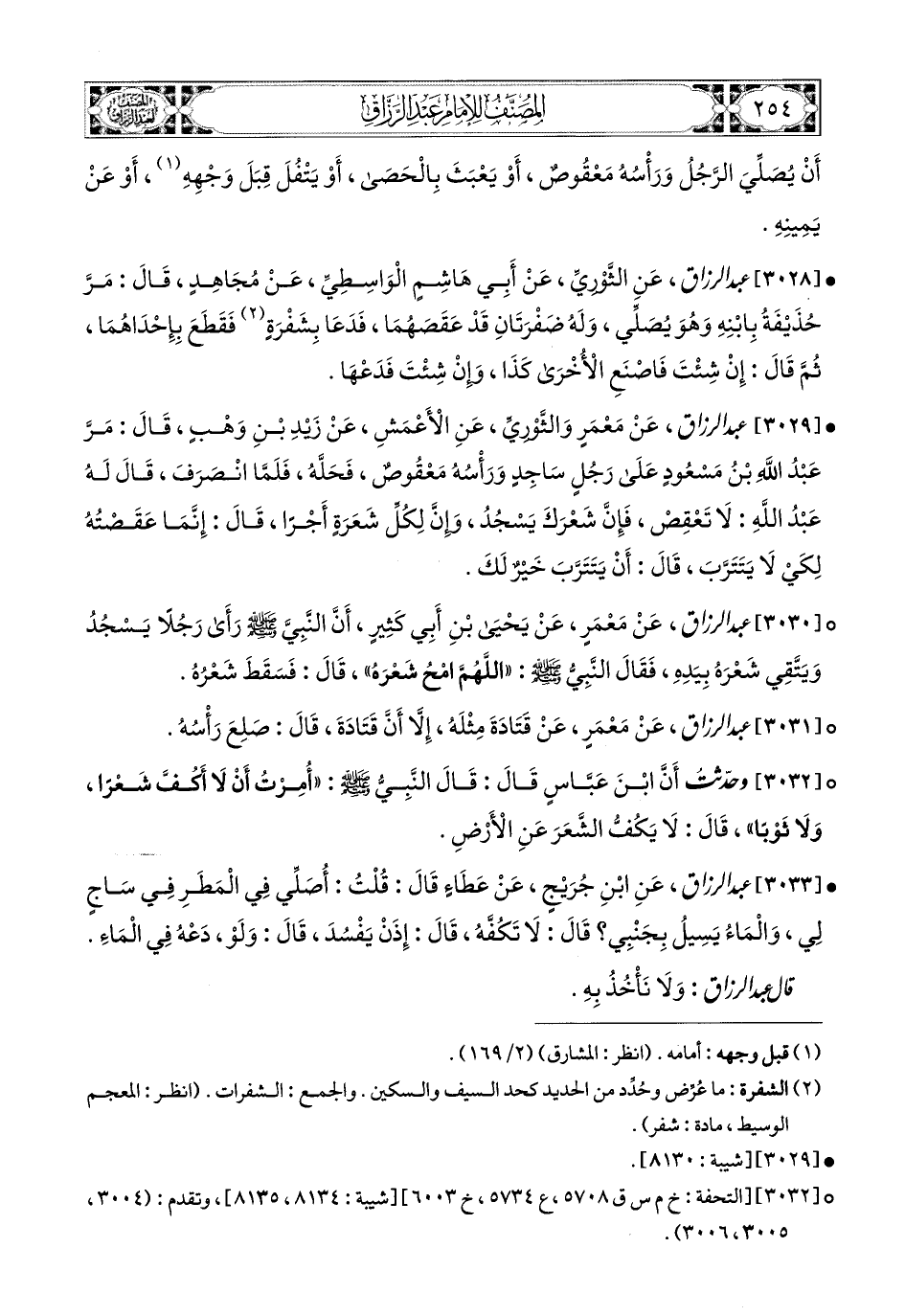 3029- عبد الرزاق، عَنْ مَعْمَرٍ، وَالثَّورِيِّ، عَنِ الأَعمَشِ، عَن زَيْدِ بْنِ وَهْبٍ قَالَ: مَرَّ عَبدُ اللهِ بن مَسْعُودٍ عَلَى رَجُلٍ سَاجِدٍ، وَرَأْسُهُ مَعْقُوصٌ، فَحَلَّهُ، فَلَمَّا انْصَرَفَ، قَالَ لَهُ عَبدُ اللهِ: لاَ تَعْقِصْ، فَإِنَّ شَعْرَكَ يَسْجُدُ، وَإِنَّ لِكُلِّ شَعْرَةٍ أَجْرًا، قَالَ: إِنَّمَا عَقَصْتُهُ لِكَيْ لاَ يَتَتَرَّبَ قَالَ: أَنْ يَتَتَرَّبَ خَيْرٌ لَكَ.