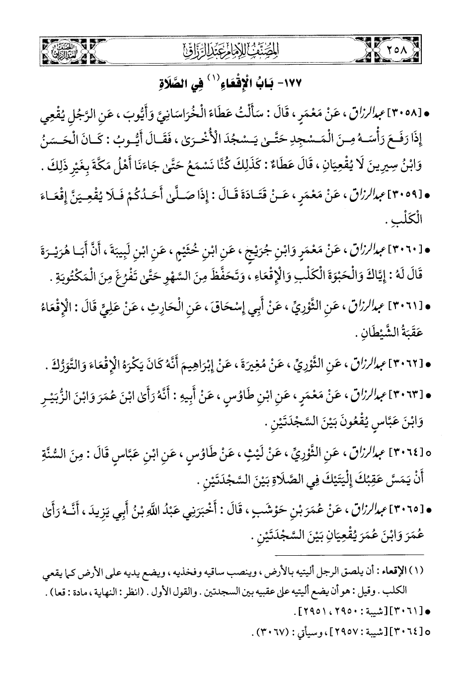 3065 - عبد الرزاق، عَن عُمَرَ بْنِ حَوْشَبٍ (1)، قَالَ: أَخْبَرَنِي عَبدُ اللهِ بن أَبِي يَزِيدَ، أَنَّهُ رَأَى عُمَرَ، وَابْنَ عُمَرَ يُقْعِيَانِ بَيْنَ السَّجْدَتَيْنِ.