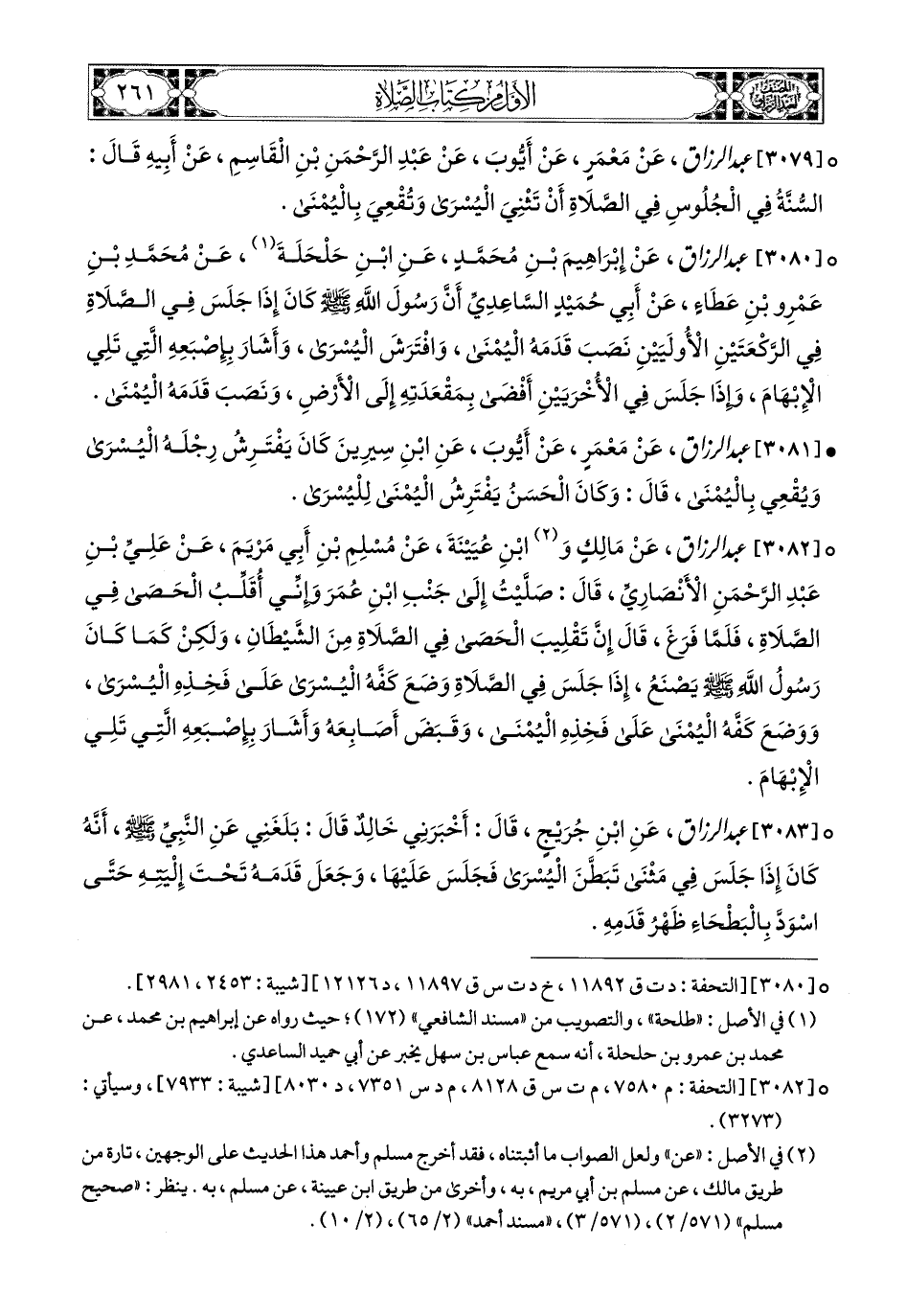 3079- عبد الرزاق، عَنْ مَعْمَرٍ، عَنْ أَيُّوبَ، عَنْ عَبدِ الرَّحْمَنِ بْنِ الْقَاسِمِ، عَنْ أَبِيهِ، قَالَ: السُّنَّةُ فِي الْجُلُوسِ فِي الصَّلاَةِ أَنْ تَثْنِيَ الْيُسْرَى وَتُقْعِيَ بِالْيُمْنَى.
