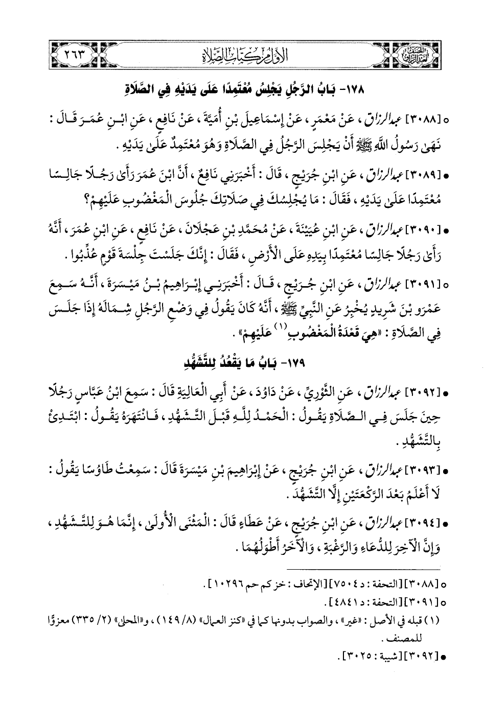 3091- عبد الرزاق، عَنِ ابْنِ جُرَيْجٍ، قَالَ: أَخْبَرَنِي إِبرَاهِيمُ بن مَيْسَرَةَ، أَنَّهُ سَمِعَ عَمْرَو بن شَرِيدٍ يُخْبِرُ عَنِ النَّبِيِّ صَلَّى اللهُ عَلَيْهِ وَسَلَّمَ، أَنَّهُ كَانَ يَقُولُ فِي وَضْعِ الرَّجُلِ شِمَالَهُ إِذَا جَلَسَ فِي الصَّلاَةِ: هِيَ قَعْدَةُ المَغْضُوبِ عَلَيْهِمْ.