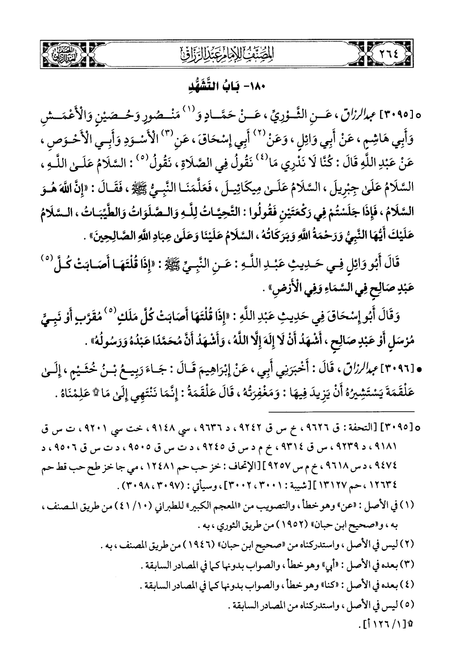 3095- عبد الرزاق، عَنِ الثَّورِيِّ، عَن حَمَّادٍ، وَمَنصُورٍ، وَحُصَيْنٍ، وَالأَعمَشِ، وَأَبِي هَاشِمٍ، عَنْ أَبِي وَائِلٍ، وَعَنْ أَبِي إِسْحَاقَ، عَنِ الأَسْوَدِ، وَأَبِي الأَحْوَصِ، عَنْ عَبدِ اللهِ قَالَ: كُنَّا لاَ نَدْرِي مَا نَقُولُ فِي الصَّلاَةِ، نَقُولُ: السَّلاَمُ عَلَى اللهِ، السَّلاَمُ عَلَى جِبْرِيلَ، السَّلاَمُ عَلَى مِيكَائِيلَ، فَعَلَّمَنَا النَّبِيُّ صَلَّى اللهُ عَلَيْهِ وَسَلَّمَ، فَقَالَ: [لاَ تَقُولُوا السَّلاَمُ عَلَى اللهِ] (1)، إِنَّ اللهَ هُوَ السَّلاَمُ، فَإِذَا جَلَسْتُمْ فِي رَكْعَتَيْنِ فَقُولُوا: التَّحِيَّاتُ للهِ وَالصَلَوَاتُ وَالطَّيِّبَاتُ، السَّلاَمُ عَلَيْكَ أَيُّهَا النَّبِيُّ وَرَحْمَةُ اللهِ وَبَرَكَاتُهُ، السَّلاَمُ عَلَيْنَا وَعَلَى عِبَادِ اللهِ الصَّالِحِينَ، قَالَ أَبو وَائِلٍ فِي حَدِيثِ عَبدِ اللهِ: عَنِ النَّبِيِّ صَلَّى اللهُ عَلَيْهِ وَسَلَّمَ: إِذَا قُلْتَهَا أَصَابَتْ كُلَّ عَبدٍ صَالِحٍ فِي السَّمَاءِ وَفِي الأَرْضِ، وَقَالَ أَبو إِسْحَاقَ فِي حَدِيثِ عَبدِ اللهِ: إِذَا قُلْتَهَا أَصَابَتْ كُلَّ مَلَكٍ مُقَرَّبٍ، أَوْ نَبِيٍّ مُرْسَلٍ، أَوْ عَبدٍ صَالِحٍ، أَشْهَدُ أَنْ لاَ إِلَهَ إِلاَّ اللهُ، وَأَشْهَدُ أَنَّ مُحَمَّدًا عَبدُهُ وَرَسُولُهُ.