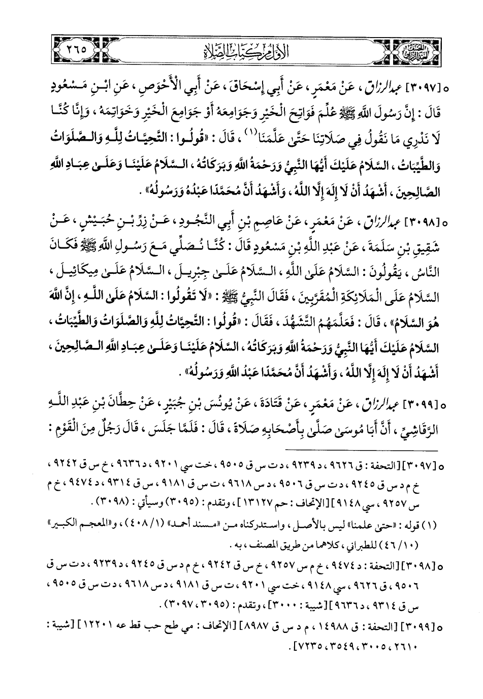 3097- عبد الرزاق، عَنْ مَعْمَرٍ، عَنْ أَبِي إِسْحَاقَ، عَنْ أَبِي الأَحْوَصِ، عَنِ ابْنِ مَسْعُودٍ قَالَ: إِنَّ رَسُولَ اللهِ صَلَّى اللهُ عَلَيْهِ وَسَلَّمَ عُلِّمَ فَوَاتِحَ الْخَيْرِ وَجَوَامِعَهُ، أَوْ جَوَامِعَ الْخَيْرِ وَخَوَاتِمَهُ، وَإِنَّا كُنَّا لاَ نَدْرِي مَا نَقُولُ فِي صَلاَتِنَا حَتَّى عَلَّمَنَا، قَالَ: قُولُوا: التَّحِيَّاتُ للهِ وَالصَلَوَاتُ وَالطَّيِّبَاتُ، السَّلاَمُ عَلَيْكَ أَيُّهَا النَّبِيُّ وَرَحْمَةُ اللهِ وَبَرَكَاتُهُ، السَّلاَمُ عَلَيْنَا وَعَلَى عِبَادِ اللهِ الصَّالِحِينَ، أَشْهَدُ أَنْ لاَ إِلَهَ إِلاَّ اللهُ، وَأَشْهَدُ أَنَّ مُحَمَّدًا عَبدُهُ وَرَسُولُهُ.