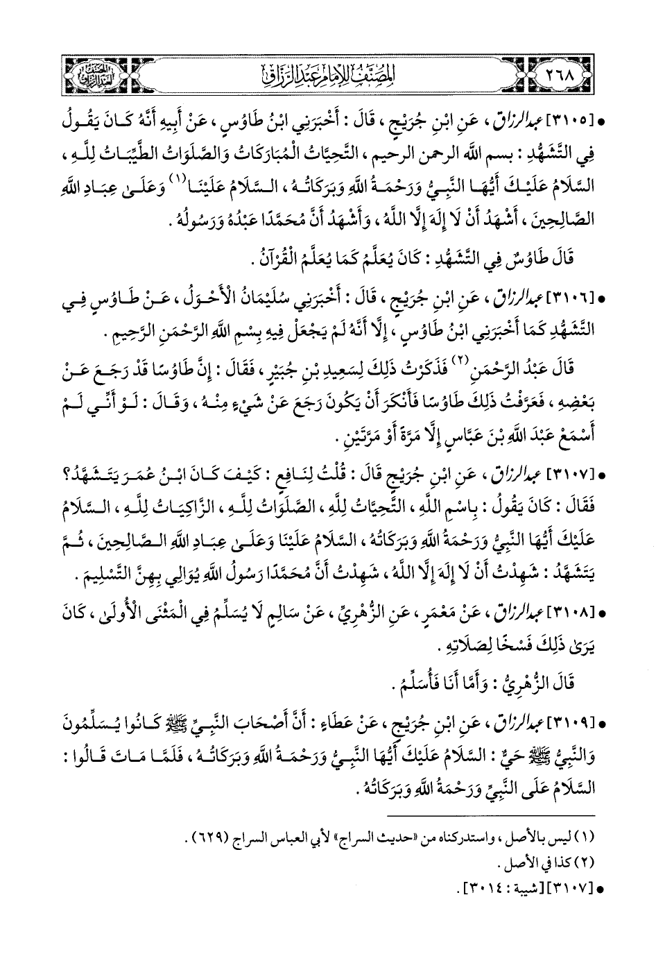 3105- عبد الرزاق، عَنِ ابْنِ جُرَيْجٍ، قَالَ: أَخْبَرَنِي ابْنُ طَاوُوسٍ، عَنْ أَبِيهِ، أَنَّهُ كَانَ يَقُولُ فِي التَّشَهُّدِ: بِسْمِ اللهِ الرَّحْمَنِ الرَّحِيمِ، التَّحِيَّاتُ المُبَارَكَاتُ، وَالصَلَوَاتُ الطَّيِّبَاتُ للهِ، السَّلاَمُ عَلَيْكَ أَيُّهَا النَّبِيُّ وَرَحْمَةُ اللهِ وَبَرَكَاتُهُ، السَّلاَمُ عَلَيْنَا وَعَلَى عِبَادِ اللهِ الصَّالِحِينَ، أَشْهَدُ أَنْ لاَ إِلَهَ إِلاَّ اللهُ، وَأَشْهَدُ أَنَّ مُحَمَّدًا عَبدُهُ وَرَسُولُهُ.