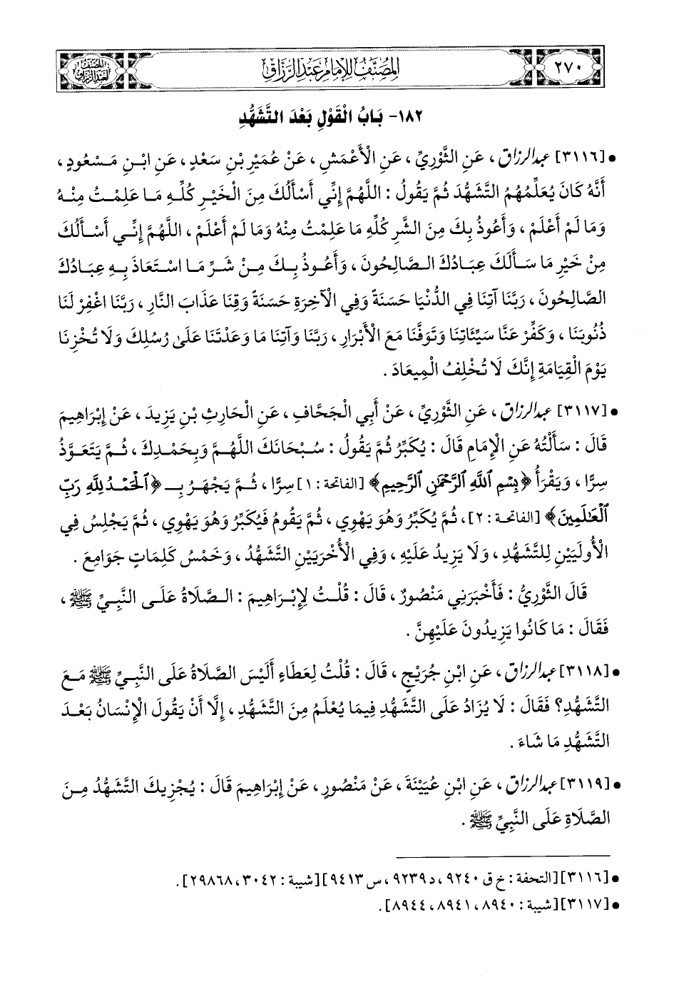 3119- عبد الرزاق، عَنِ ابْنِ عُيَيْنَةَ، عَنْ مَنصُورٍ، عَن إِبرَاهِيمَ، قَالَ: يُجْزِيكَ التَّشَهُّدُ مِنَ الصَّلاَةِ عَلَى النَّبِيِّ صَلَّى اللهُ عَلَيْهِ وَسَلَّمَ.