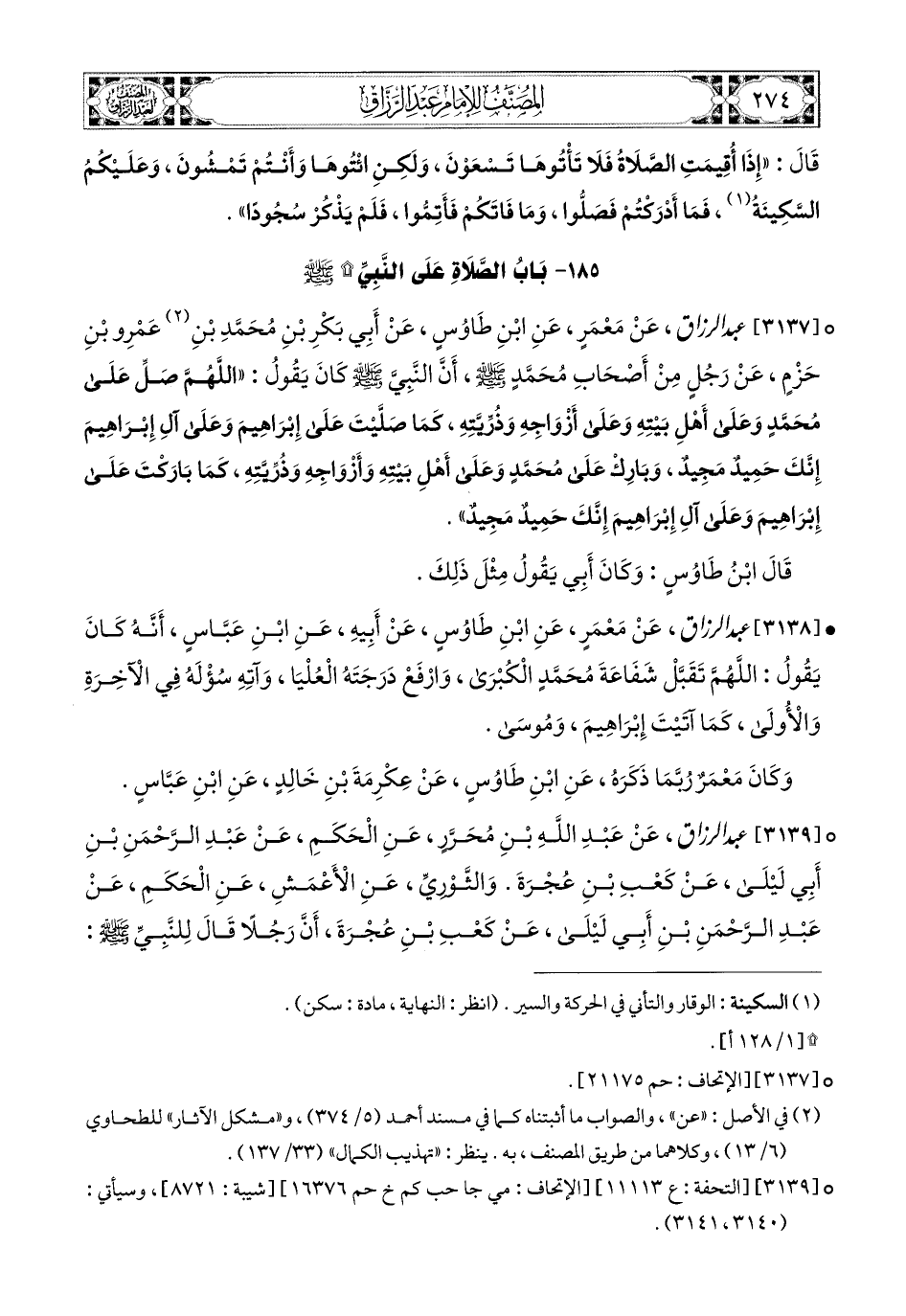 3137 - عبد الرزاق، عَنْ مَعْمَرٍ، عَنِ ابْنِ طَاوُوسٍ، عَنْ أَبِي بَكْرِ بْنِ مُحَمَّدِ بْنِ (1) عَمْرِو بنِ حَزْمٍ، عَن رَجُلٍ مِنْ أَصْحَابِ مُحَمَّدٍ صَلَّى اللهُ عَلَيْهِ وَسَلَّمَ، أَنَّ النَّبِيَّ صَلَّى اللهُ عَلَيْهِ وَسَلَّمَ كَانَ يَقُولُ: اللهُمَّ صَلِّ عَلَى مُحَمَّدٍ، وَعَلَى أَهْلِ بَيْتِهِ، وَعَلَى أَزْوَاجِهِ، وَذُرِّيَّتِهِ، كَمَا صَلَّيْتَ عَلَى إِبرَاهِيمَ، وَعَلَى آلِ إِبرَاهِيمَ إِنَّكَ حَمِيدٌ مَجِيدٌ، وَبَارِكْ عَلَى مُحَمَّدٍ وَعَلَى أَهْلِ بَيْتِهِ، وَأَزْوَاجِهِ وَذُرِّيَّتِهِ، كَمَا بَارَكْتَ عَلَى إِبرَاهِيمَ وَعَلَى آلِ إِبرَاهِيمَ، إِنَّكَ حَمِيدٌ مَجِيدٌ.