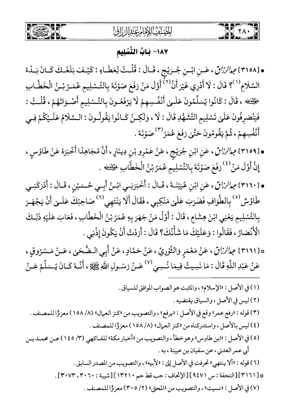3158- عبد الرزاق، عَنِ ابْنِ جُرَيْجٍ، قَالَ: قُلْتُ لِعَطَاءٍ: كَيْفَ بَلَغَكَ كَانَ بَدْءُ السَّلاَمِ؟ قَالَ: لاَ أَدْرِي، غَيْرَ أَنَّ أَوَّلَ مَنْ رَفَعَ صَوْتَهُ بِالتَّسْلِيمِ: عُمَرُ بن الْخَطَّابِ رَضِيَ اللهُ عَنْهُ، قَالَ: كَانُوا يُسَلِّمُونَ عَلَى أَنْفُسِهِمْ لاَ يَرْفَعُونَ بِالتَّسْلِيمِ أَصْوَاتَهُمْ قُلْتُ: فَيَنْصَرِفُونَ عَلَى تَسْلِيمِ التَّشَهُّدِ؟ قَالَ: لاَ، وَلَكِنْ كَانُوا يَقُولُونَ: السَّلاَمُ عَلَيْكُمْ فِي أَنْفُسِهِمْ، ثُمَّ يَقُومُونَ حَتَّى رَفَعَ عُمَرُ صَوْتَهُ.