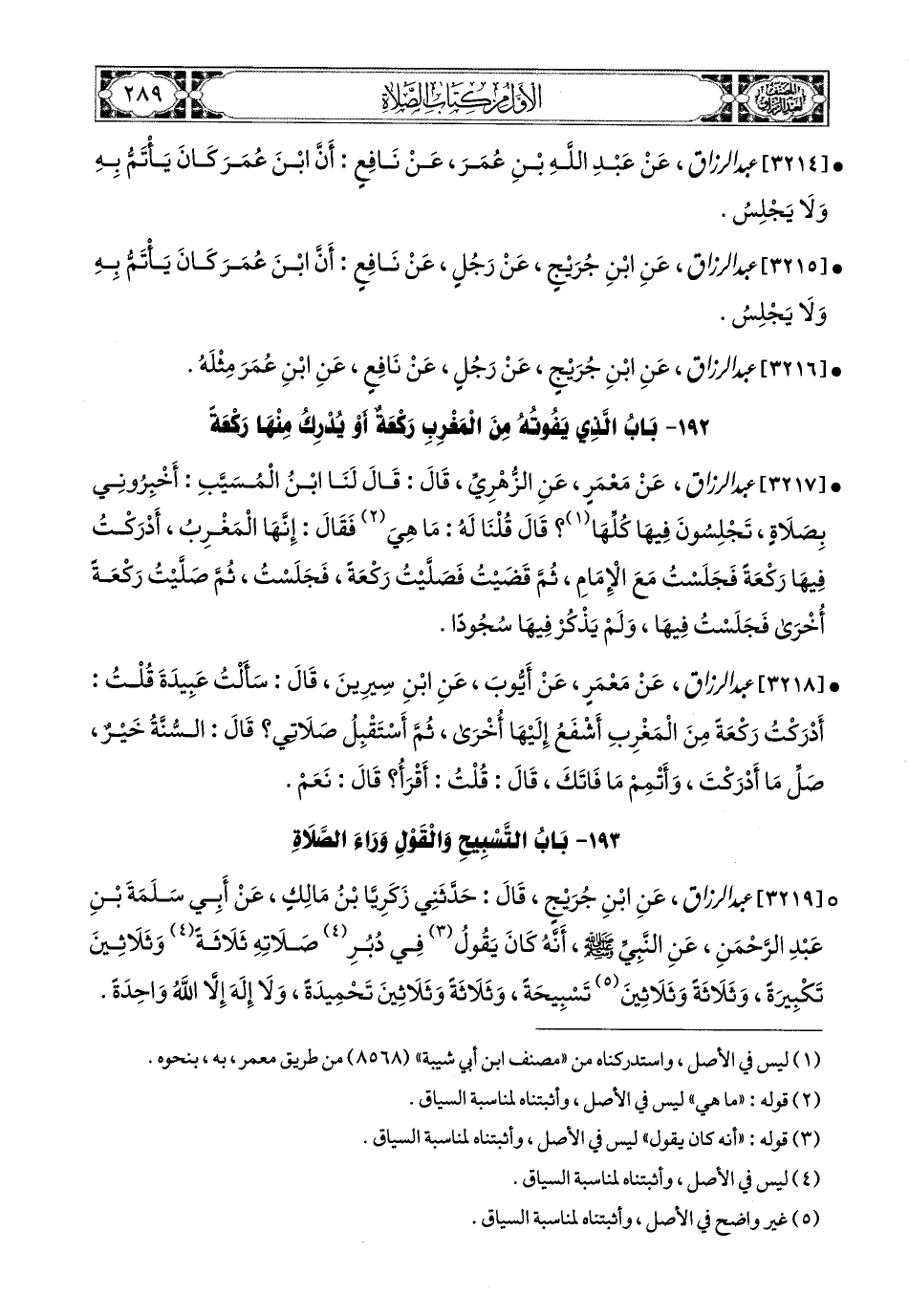 3219 - عبد الرزاق، عَنِ ابْنِ جُرَيْجٍ، قَالَ: حَدَّثَنِي زَكَرِيَّا بن مَالِكٍ، عَنْ أَبِي سَلَمَةَ بْنِ عَبدِ الرَّحْمَنِ، عَنِ النَّبِيِّ صَلَّى اللهُ عَلَيْهِ وَسَلَّمَ [أنه كَانَ يَقُولُ] (1) فِي [دُبُرِ] (1) صَلاَتِهِ [ثَلَاثَةً] (1) وَثَلاَثِينَ تَكْبِيرَةً، وَثَلاَثَةً وَثَلاَثِينَ تَسْبِيحَةً وَثَلاَثَةً وَثَلاَثِينَ تَحْمِيدَةً، وَلاَ إِلَهَ إِلاَّ اللهُ وَاحِدَةً.