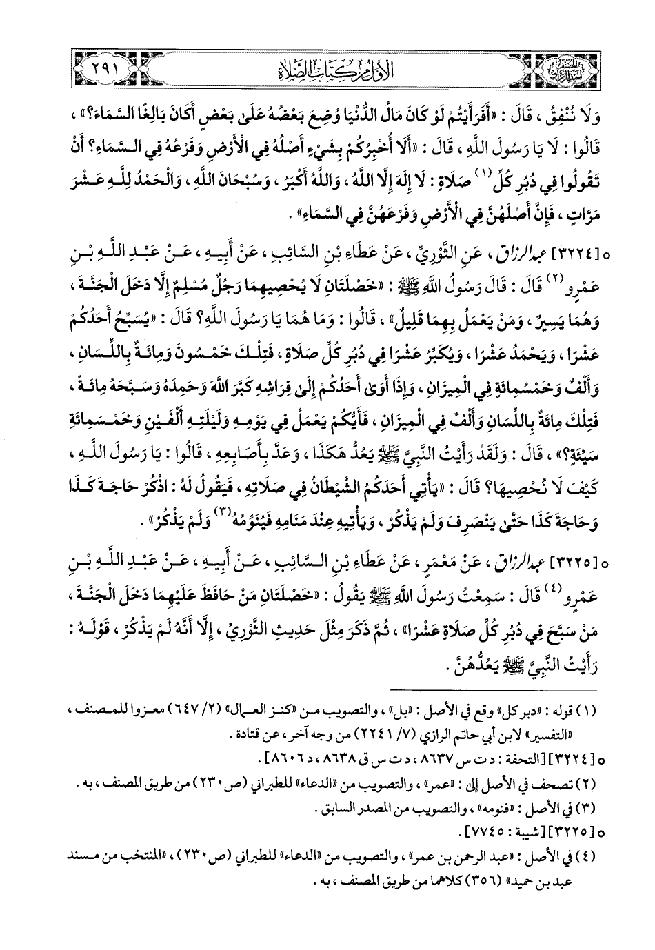 3224- عبد الرزاق، عَنِ الثَّورِيِّ، عَنْ عَطَاءِ بْنِ السَّائِبِ، عَنْ أَبِيهِ، عَنْ عَبدِ اللهِ بْنِ عَمْرٍو، قَالَ: قَالَ رَسُولُ اللهِ صَلَّى اللهُ عَلَيْهِ وَسَلَّمَ: خَصْلَتَانِ لاَ يُحْصِيهِمَا رَجُلٌ مُسْلِمٌ إِلاَّ دَخَلَ الْجَنَّةَ، وَهُمَا يَسِيرٌ، وَمَنْ يَعْمَلُ بِهِمَا قَلِيلٌ، قَالُوا: وَمَا هُمَا يَا رَسُولَ اللهِ؟ قَالَ: يُسَبِّحُ أَحَدُكُمْ عَشْرًا، وَيَحْمَدُ عَشْرًا، وَيُكَبِّرُ عَشْرًا فِي دُبُرِ كُلِّ صَلاَةٍ، فَتِلْكَ خَمْسُونَ وَمِئَةٌ بِاللِّسَانِ، وَأَلْفٌ وَخَمْسُ مِئَةٍ فِي المِيزَانِ، وَإِذَا أَوَى أَحَدُكُمْ إِلَى فِرَاشِهِ كَبَّرَ اللهَ وَحَمِدَهُ وَسَبَّحَهُ مِئَةً، فَتِلْكَ مِئَةٌ بِاللِّسَانِ، وَأَلْفٌ فِي المِيزَانِ، فَأَيُّكُمْ يَعْمَلُ فِي يَوْمِهِ وَلَيْلَتِهِ أَلْفَيْنِ وَخَمْسَمِئَةِ سَيِّئَةٍ؟ قَالَ: وَلَقَدْ رَأَيْتُ النَّبِيَّ صَلَّى اللهُ عَلَيْهِ وَسَلَّمَ يَعُدُّ هَكَذَا، وَعَدَّ بِأَصَابِعِهِ، قَالُوا: يَا رَسُولَ اللهِ، كَيْفَ لاَ نُحْصِيهَا؟ قَالَ: يَأْتِي أَحَدَكُمُ الشَّيْطَانُ فِي صَلاَتِهِ، فَيَقُولُ لَهُ: اذْكُرْ حَاجَةَ كَذَا وَحَاجَةَ كَذَا، حَتَّى يَنْصَرِفَ وَلَمْ يَذْكُرْ، وَيَأْتِيهِ عِنْدَ مَنَامِهِ فَيُنَوِّمُهُ وَلَمْ يَذْكُرْ.