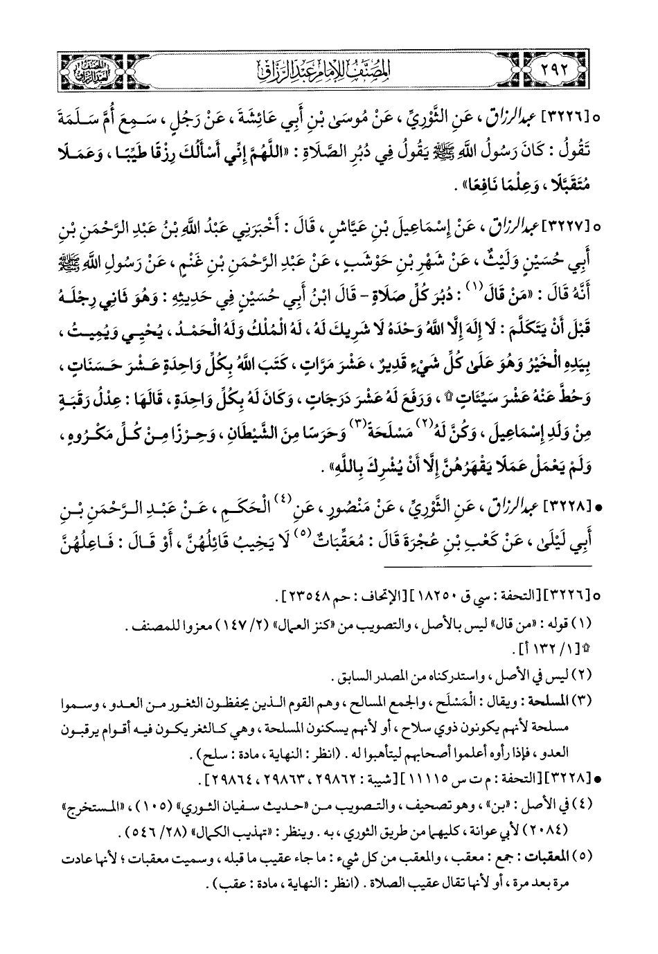 3227- عبد الرزاق، عَن إِسْمَاعِيلَ بْنِ عَيَّاشٍ، قَالَ: أَخْبَرَنِي عَبدُ اللهِ بن عَبدِ الرَّحْمَنِ بْنِ أَبِي حُسَيْنٍ، وَلَيْثٌ، عَن شَهْرِ بْنِ حَوْشَبٍ، عَنْ عَبدِ الرَّحْمَنِ بْنِ غَنْمٍ، عَن رَسُولِ اللهِ صَلَّى اللهُ عَلَيْهِ وَسَلَّمَ، أَنَّهُ قَالَ: مَنْ قَالَ دُبُرَ كُلِّ صَلاَةٍ، قَالَ ابْنُ أَبِي حُسَيْنٍ فِي حَدِيثِهِ: وَهُوَ ثَانِي رِجْلَهُ، قَبْلَ أَنْ يَتَكَلَّمَ، لاَ إِلَهَ إِلاَّ اللهُ وَحْدَهُ لاَ شَرِيكَ لَهُ، لَهُ المُلْكُ وَلَهُ الْحَمْدُ، يُحْيِي وَيُمِيتُ، بِيَدِهِ الْخَيْرُ وَهُوَ عَلَى كُلِّ شَيْءٍ قَدِيرٌ، عَشْرَ مَرَّاتٍ، كَتَبَ اللهُ بِكُلِّ وَاحِدَةٍ عَشْرَ حَسَنَاتٍ، وَحَطَّ عَنْهُ عَشْرَ سَيِّئَاتٍ، وَرَفَعَ لَهُ عَشْرَ دَرَجَاتٍ، وَكَانَ لَهُ بِكُلِّ وَاحِدَةٍ قَالَهَا عِدْلُ رَقَبَةٍ مِنْ وَلَدِ إِسْمَاعِيلَ، وَكُنَّ مَسْلَحَةً وَحَرَسًا مِنَ الشَّيْطَانِ، وَحِرْزًا مِنْ كُلِّ مَكْرُوهٍ، وَلَمْ يَعْمَلْ عَمَلاً يَقْهَرُهُنَّ إِلاَّ أَنْ يُشْرِكَ بِاللهِ.