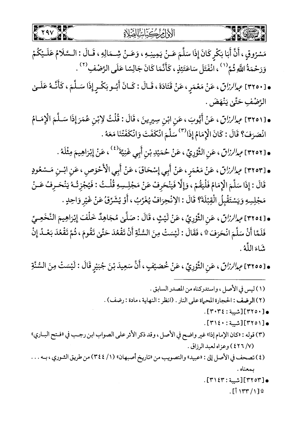 3250- عبد الرزاق، عَنْ مَعْمَرٍ، عَن قَتَادَةَ، قَالَ: كَانَ أَبو بَكْرٍ إِذَا سَلَّمَ كَأَنَّهُ عَلَى الرَّضَفِ حَتَّى يَنْهَضَ.