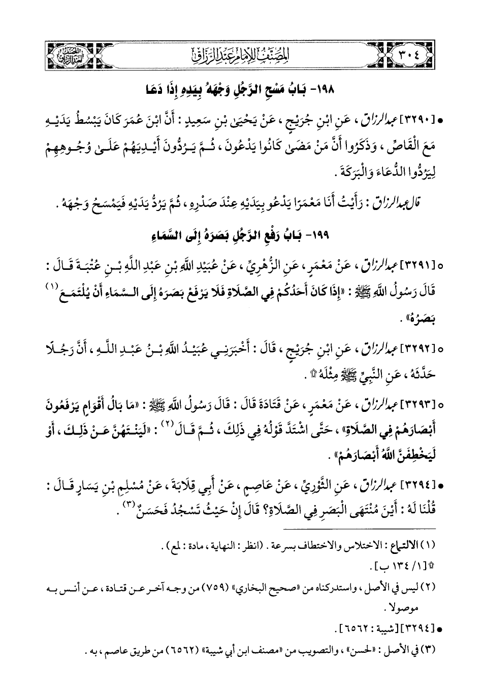 3293- عبد الرزاق، عَنْ مَعْمَرٍ، عَن قَتَادَةَ، قَالَ: قَالَ رَسُولُ اللهِ صَلَّى اللهُ عَلَيْهِ وَسَلَّمَ: مَا بَالُ أَقْوَامٍ يَرْفَعُونَ أَبْصَارَهُمْ فِي الصَّلاَةِ، حَتَّى اشْتَدَّ قَوْلُهُ فِي ذَلِكَ، ثُمَّ قَالَ: لَيَنْتَهُنَّ عَن ذَلِكَ، أَوْ لَيَخْطِفَنَّ اللهُ أَبْصَارَهُمْ.