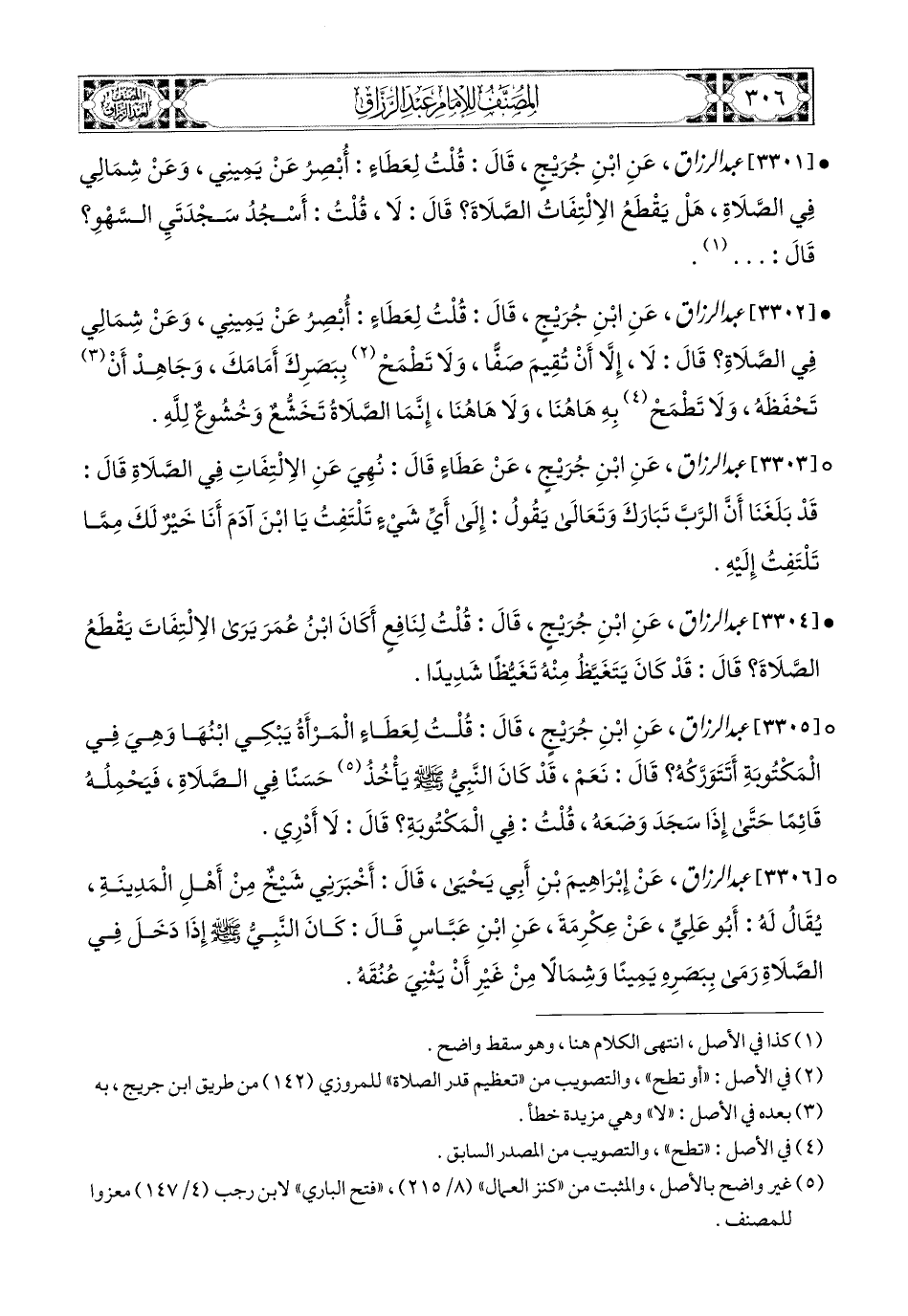 3301 - عبد الرزاق، عَنِ ابْنِ جُرَيْجٍ، قَالَ: قُلْتُ لِعَطَاءٍ: أُبْصِرُ عَن يَمِينِي وَعَنْ شِمَالِي فِي الصَّلاَةِ، هَلْ يَقْطَعُ الاِلْتِفَاتُ الصَّلاَةَ؟ قَالَ: لاَ، قُلْتُ: أَسْجُدُ سَجْدَتَيِ السَّهْوِ؟ قَالَ .... (1).