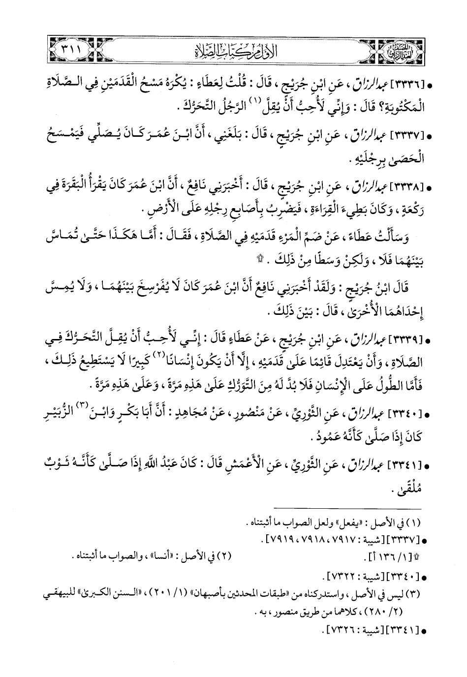 3336- عبد الرزاق، عَنِ ابْنِ جُرَيْجٍ، قَالَ: قُلْتُ لِعَطَاءٍ: يُكْرَهُ مَسْحُ الْقَدَمَيْنِ فِي الصَّلاَةِ المَكْتُوبَةِ؟ قَالَ: وَإِنِّي لأُحِبُّ أَنْ يُقِلَّ الرَّجُلُ التَّحَرُّكَ.