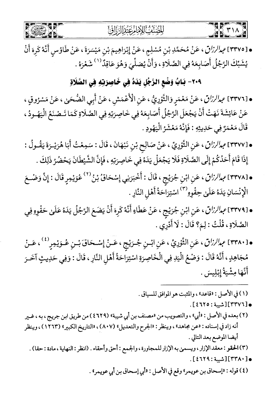 3379- عبد الرزاق، عَنِ ابْنِ جُرَيْجٍ، عَنْ عَطَاءٍ، أَنَّهُ كَرِهَ أَنْ يَضَعَ الرَّجُلُ يَدَهُ عَلَى حَقْوِهِ فِي الصَّلاَةِ، قُلْتُ: لِمَ؟ قَالَ: لاَ أَدْرِي.
