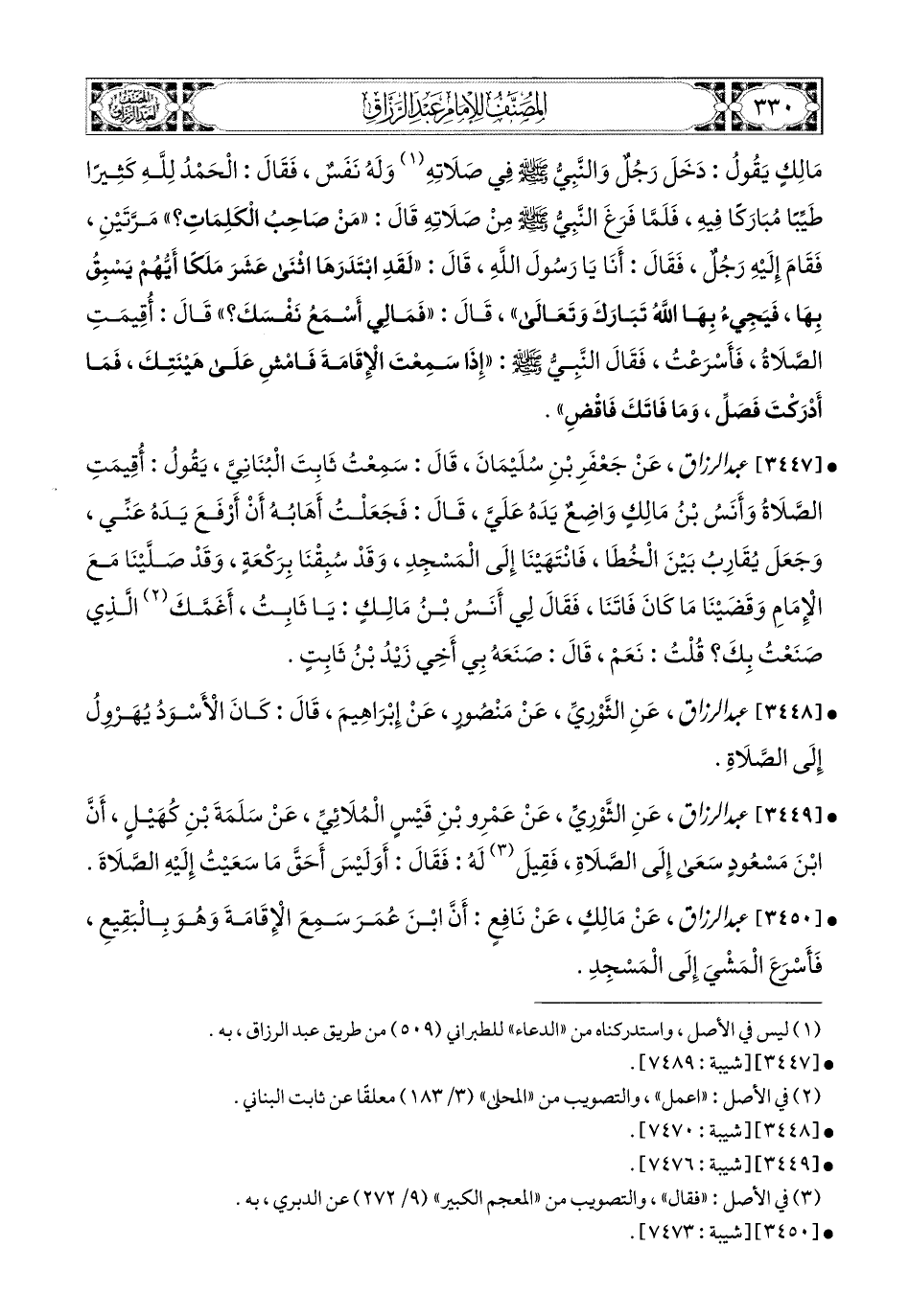 3450- عبد الرزاق، عَنْ مَالِكٍ، عَن نَافِعٍ، أَنَّ ابْنَ عُمَرَ سَمِعَ الإِقَامَةَ وَهُوَ بِالْبَقِيعِ، فَأَسْرَعَ المَشْيَ إِلَى المَسْجِدِ.
