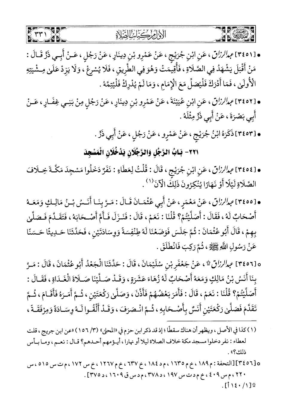 3454- عبد الرزاق، عَنِ ابْنِ جُرَيْجٍ، قَالَ: قُلْتُ لِعَطَاءٍ: نَفَرٌ دَخَلُوا مَسْجِدَ مَكَّةَ خِلاَفَ الصَّلاَةِ لَيْلاً، أَوْ نَهَارًا يُنْكِرُونَ ذَلِكَ الآنَ.