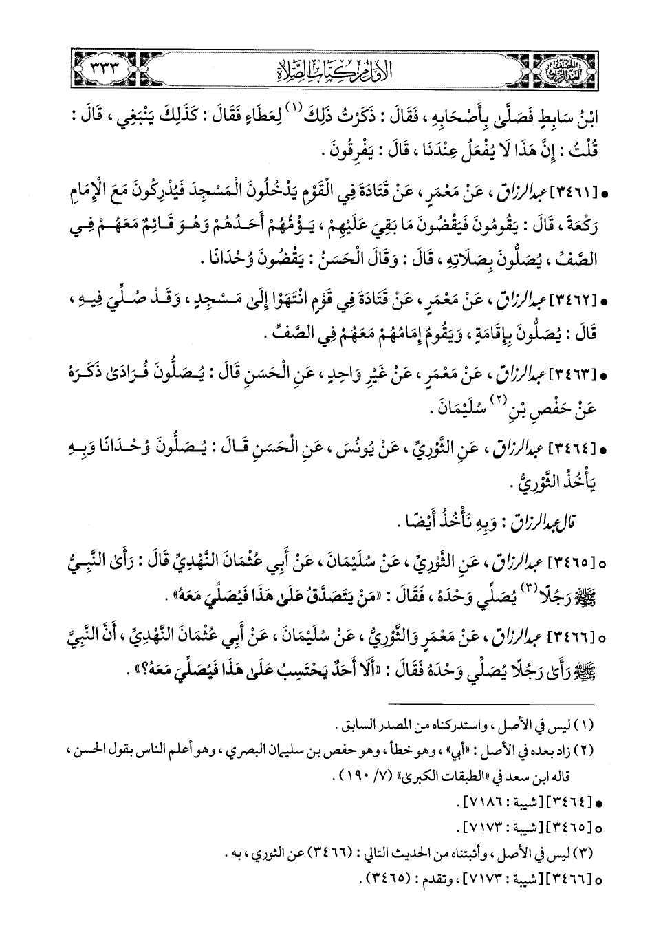 3466- عبد الرزاق، عَنْ مَعْمَرٍ، وَالثَّورِيِّ، عَن سُلَيْمَانَ، عَنْ أَبِي عُثْمَانَ النَّهْدِيِّ، أَنَّ النَّبِيَّ صَلَّى اللهُ عَلَيْهِ وَسَلَّمَ رَأَى رَجُلاً يُصَلِّي وَحْدَهُ، فَقَالَ: أَلاَ أَحَدٌ يَحْتَسِبُ عَلَى هَذَا فَيُصَلِّيَ مَعَهُ؟.