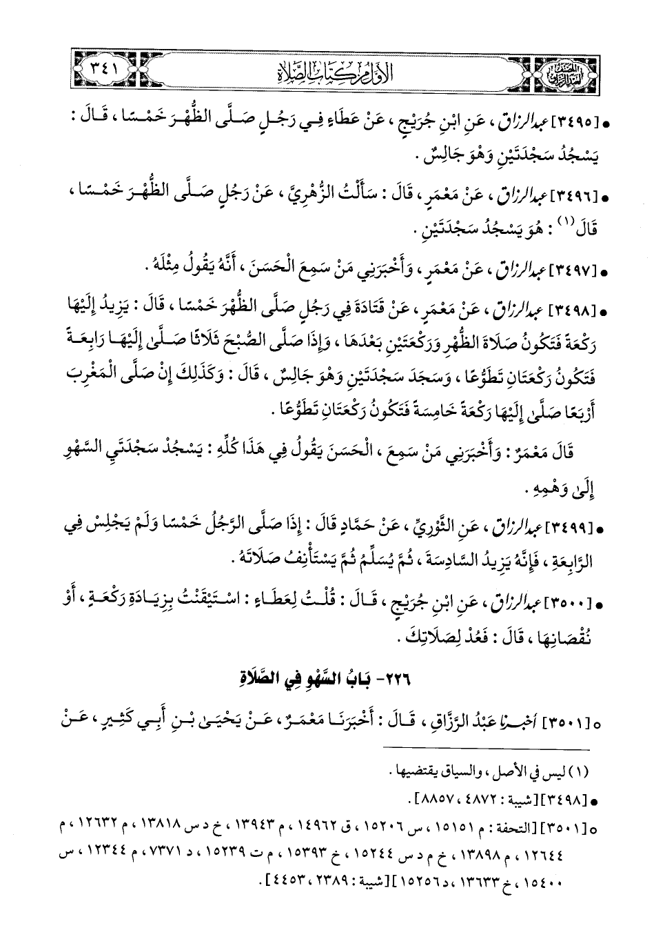 3496- عبد الرزاق، عَنْ مَعْمَرٍ، قَالَ: سَأَلْتُ الزُّهْرِيَّ عَن رَجُلٍ صَلَّى الظُّهْرَ خَمْسًا؟ قَالَ: هُوَ يَسْجُدُ سَجْدَتَيْنِ.