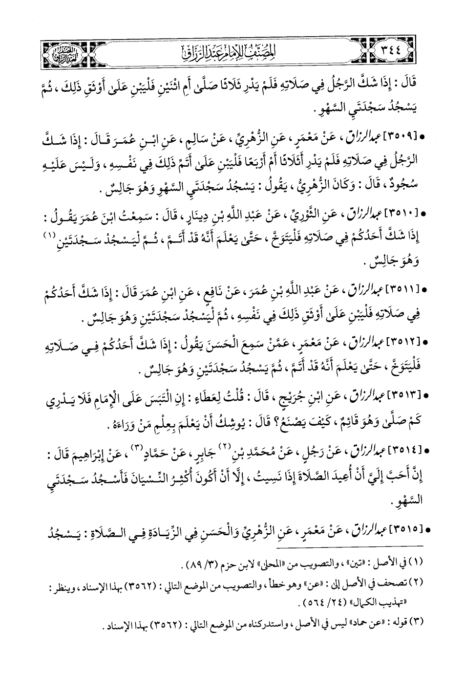 3509- عبد الرزاق، عَنْ مَعْمَرٍ، عَنِ الزُّهْرِيِّ، عَن سَالِمٍ، عَنِ ابْنِ عُمَرَ، قَالَ: إِذَا شَكَّ الرَّجُلُ فِي صَلاَتِهِ، فَلَمْ يَدْرِ أَثَلاَثًا أَمْ أَرْبَعًا، فَلْيَبْنِ عَلَى أَتَمِّ ذَلِكَ فِي نَفْسِهِ، وَلَيْسَ عَلَيْهِ سُجُودٌ قَالَ: وَكَانَ الزُّهْرِيُّ يَقُولُ: يَسْجُدُ سَجْدَتَيِ السَّهْوِ وَهُوَ جَالِسٌ.