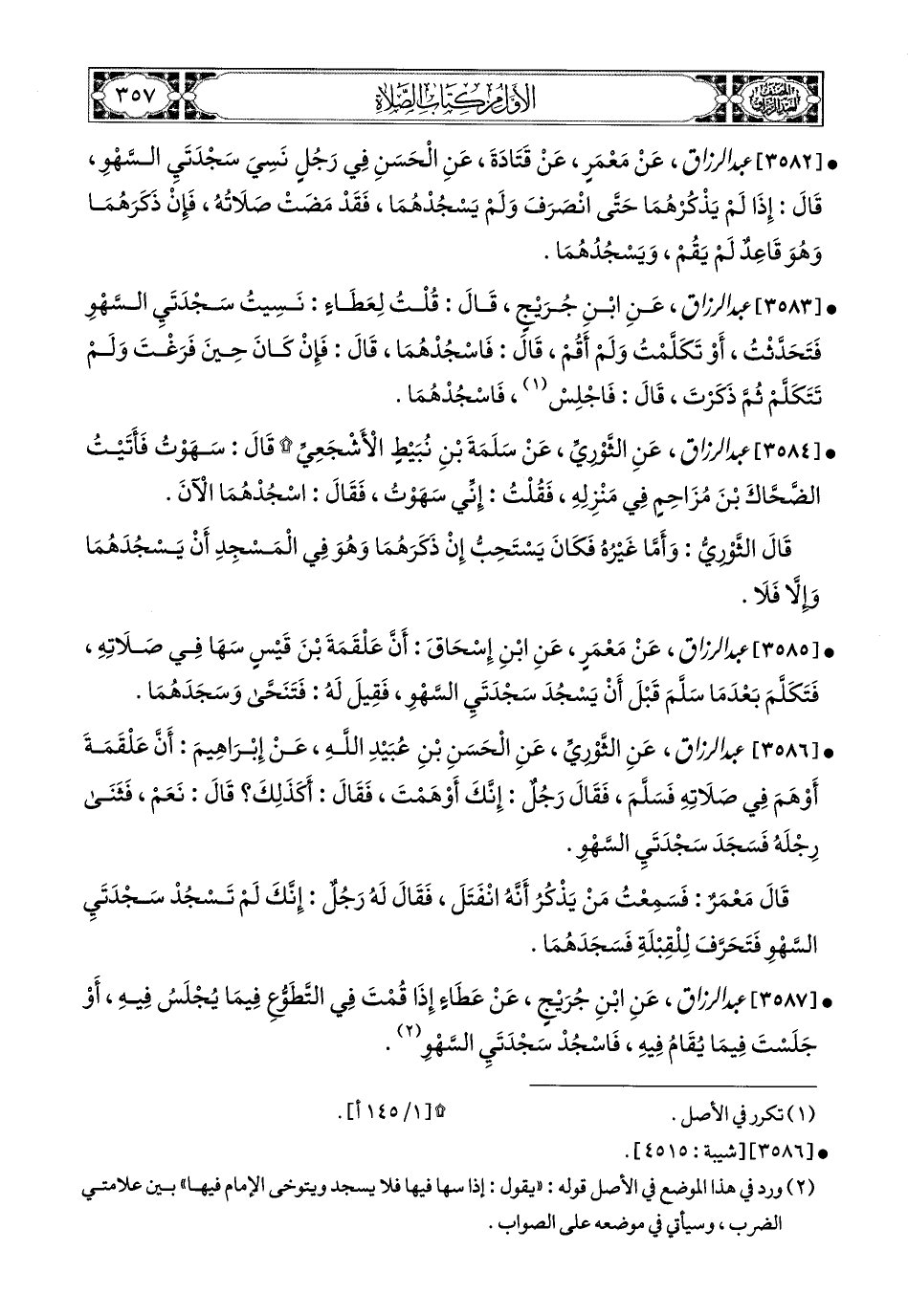 3584- عبد الرزاق، عَنِ الثَّورِيِّ، عَن سَلَمَةَ بْنِ نُبَيْطٍ الأَشْجَعِيِّ، قَالَ: سَهَوْتُ، فَأَتَيْتُ الضَّحَاكَ بن مُزَاحِمٍ فِي مَنْزِلِهِ، فَقُلْتُ: إِنِّي سَهَوْتُ، فَقَالَ: اسْجُدْهُمَا الآنَ.