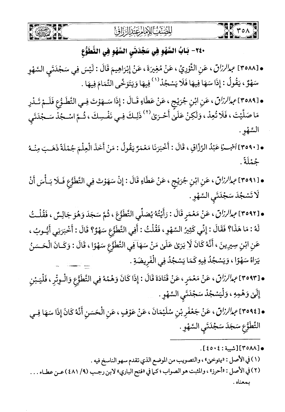3592- عبد الرزاق، عَنْ مَعْمَرٍ، قَالَ: رَأَيْتُهُ يُصَلِّي التَّطَوُّعَ، ثُمَّ سَجَدَ وَهُوَ جَالِسٌ، فَقُلْتُ لَهُ: مَا هَذَا؟ فَقَالَ: إِنِّي كَثِيرُ السَّهْوِ، فَقُلْتُ: أَفِي التَّطَوُّعِ سَهْوٌ؟ قَالَ: أَخْبَرَنِي أَيُّوبُ، عَنِ ابْنِ سِيرِينَ، أَنَّهُ كَانَ لاَ يَرَى عَلَى مَنْ سَهَا فِي التَّطَوُّعِ سَهْوًا.