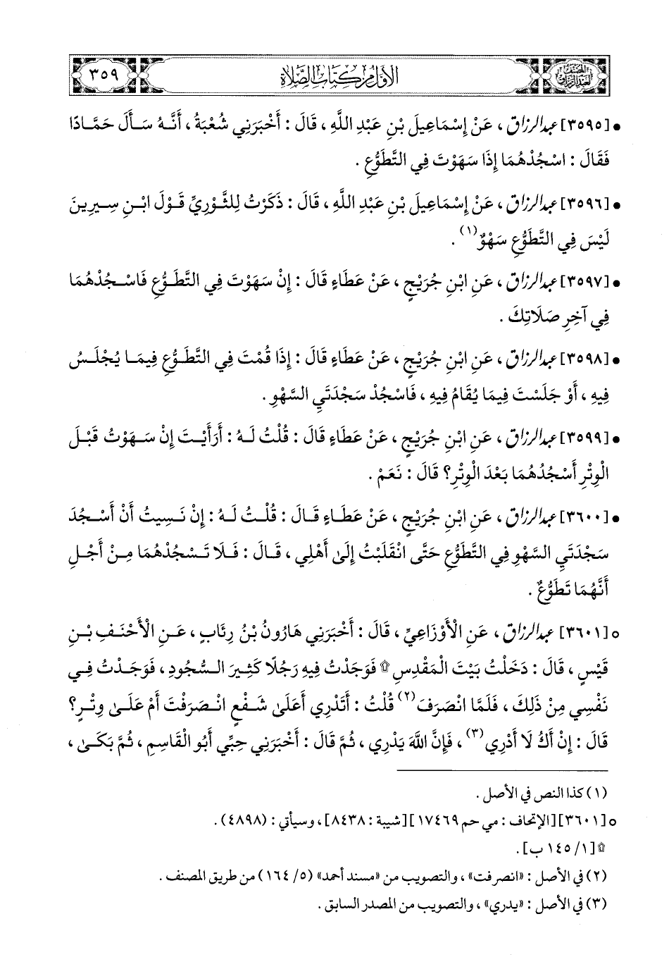 3596- عبد الرزاق، عَن إِسْمَاعِيلَ بْنِ عَبدِ اللهِ قَالَ: ذَكَرْتُ لِلثَّوْرِيِّ قَوْلَ ابْنِ سِيرِينَ: لَيْسَ فِي التَّطَوُّعِ سَهْوٌ.