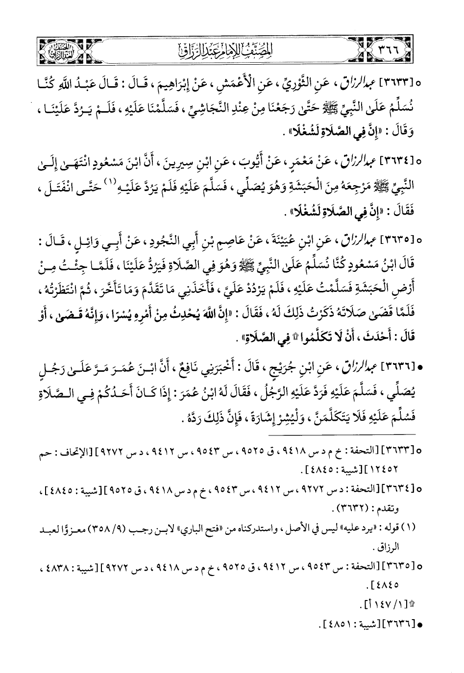 3634- عبد الرزاق، عَنْ مَعْمَرٍ عَنْ أَيُّوبَ، عَنِ ابْنِ سِيرِينَ، أَنَّ ابْنَ مَسْعُودٍ انْتَهَى إِلَى النَّبِيِّ صَلَّى اللهُ عَلَيْهِ وَسَلَّمَ مَرْجِعَهُ مِنَ الْحَبَشَةِ وَهُوَ يُصَلِّي، فَسَلَّمَ عَلَيْهِ، فَلَمْ يَرُدَّ عَلَيْهِ، حَتَّى انْفَتَلَ، فَقَالَ: إِنَّ فِي الصَّلاَةِ لَشُغْلاً.
