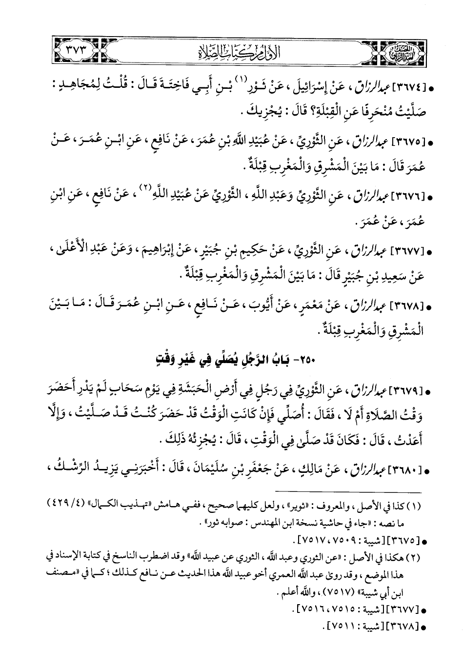 3675- عبد الرزاق، عَنِ الثَّورِيِّ، عَن عُبَيْدِ اللهِ بْنِ عُمَرَ، عَن نَافِعٍ، عَنِ ابْنِ عُمَرَ، عَن عُمَرَ، قَالَ: مَا بَيْنَ المَشْرِقِ وَالمَغْرِبِ قِبْلَةٌ.