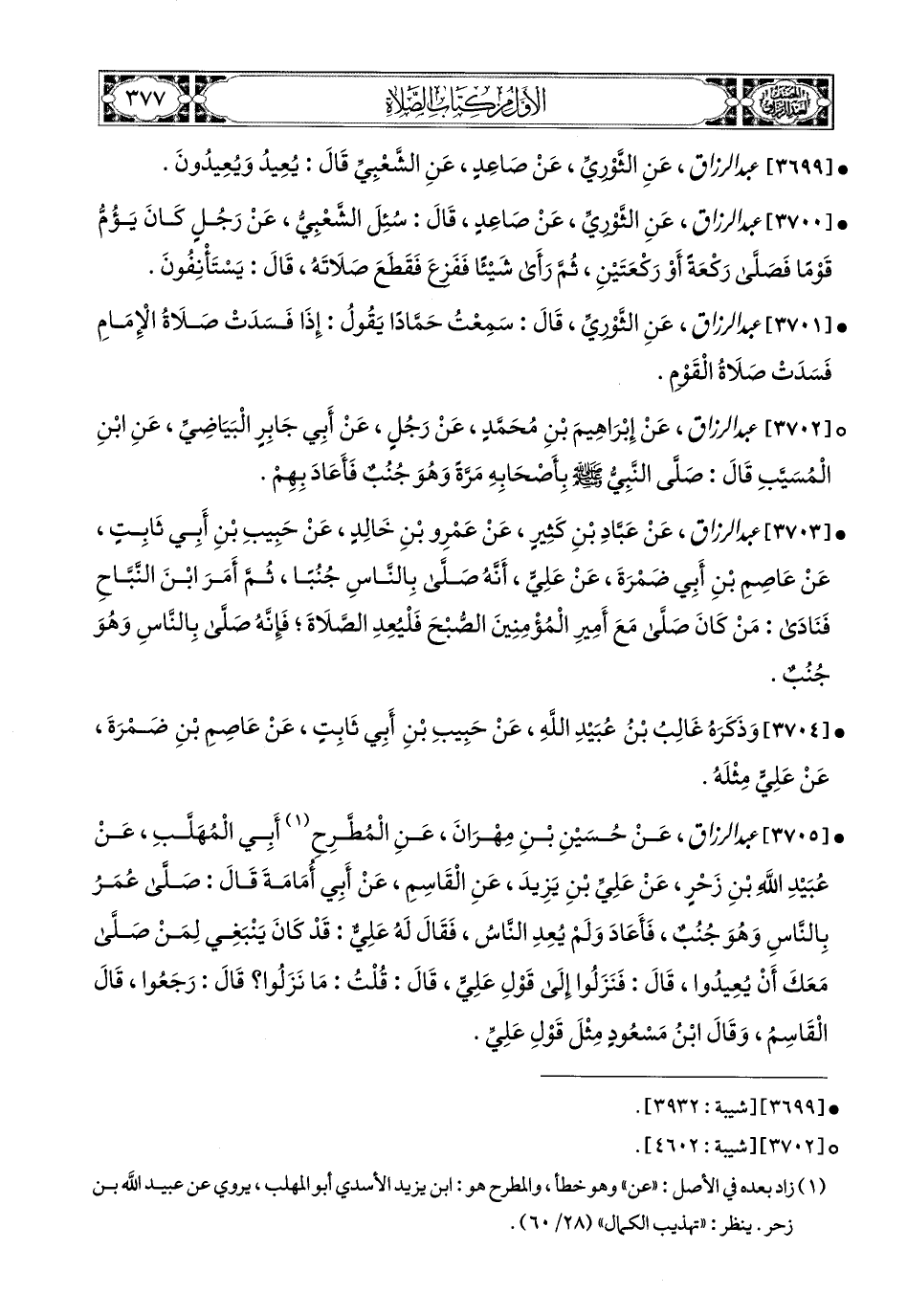 3701- عبد الرزاق، عَنِ الثَّورِيِّ، قَالَ: سَمِعْتُ حَمَّادًا يَقُولُ: إِذَا فَسَدَتْ صَلاَةُ الإِمَامِ فَسَدَتْ صَلاَةُ الْقَوْمِ.