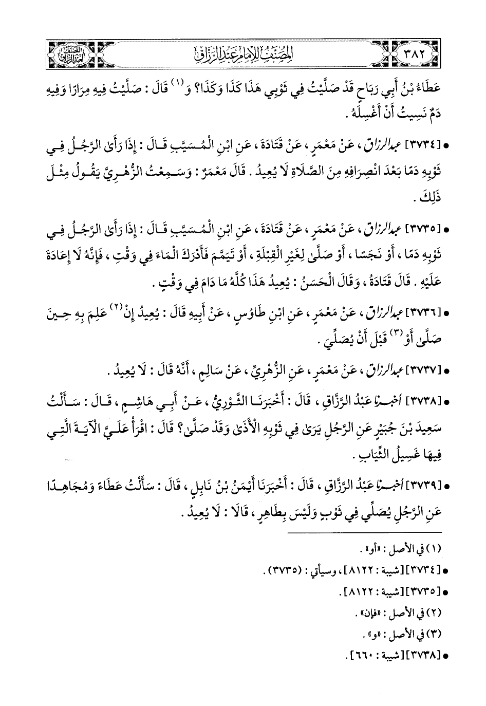 3734- عبد الرزاق، عَنْ مَعْمَرٍ، عَن قَتَادَةَ، عَنِ ابْنِ المُسَيَّبِ، قَالَ: إِذَا رَأَى الرَّجُلُ فِي ثَوْبِهِ دَمًا بَعْدَ انْصِرَافِهِ مِنَ الصَّلاَةِ لاَ يُعِيدُ.