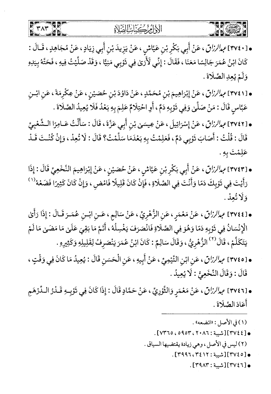 3744- عبد الرزاق، عَنْ مَعْمَرٍ، عَنِ الزُّهْرِيِّ، عَن سَالِمٍ، عَنِ ابْنِ عُمَرَ، قَالَ: إِذَا رَأَى الإِنْسَانُ فِي ثَوْبِهِ دَمًا وَهُوَ فِي الصَّلاَةِ، فَانْصَرَفَ يَغْسِلُهُ، أَتَمَّ مَا بَقِيَ عَلَى مَا مَضَى مَا لَمْ يَتَكَلَّمْ.