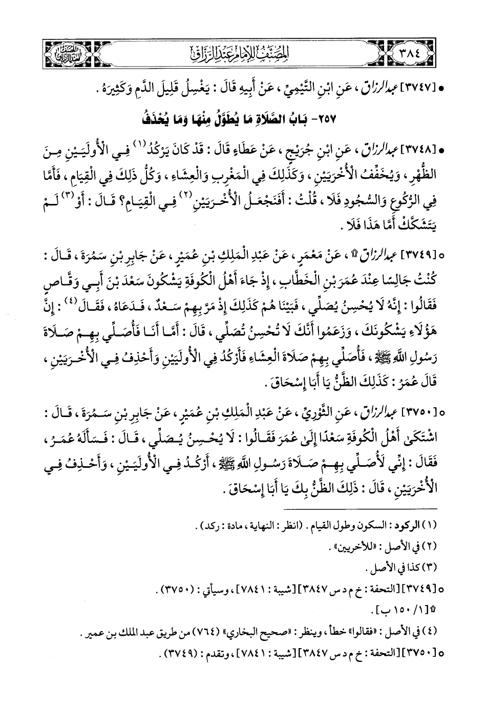 3750- عبد الرزاق، عَنِ الثَّورِيِّ، عَنْ عَبدِ المَلِكِ بْنِ عُمَيْرٍ، عَن جَابِرِ بْنِ سَمُرَةَ قَالَ: اشْتَكَى أَهْلُ الْكُوفَةِ سَعْدًا إِلَى عُمَرَ، فَقَالُوا: لاَ يُحْسِنُ يُصَلِّي، قَالَ: فَسَأَلَهُ عُمَرُ، فَقَالَ: إِنِّي لأُصَلِّي بِهِمْ صَلاَةَ رَسُولِ اللهِ صَلَّى اللهُ عَلَيْهِ وَسَلَّمَ، أَرْكُدُ فِي الأُولَيَيْنِ، وَأَحْذِفُ فِي الأُخْرَيَيْنِ، قَالَ: ذَلِكَ الظَّنُّ بِكَ يَا أَبَا إِسْحَاقَ.