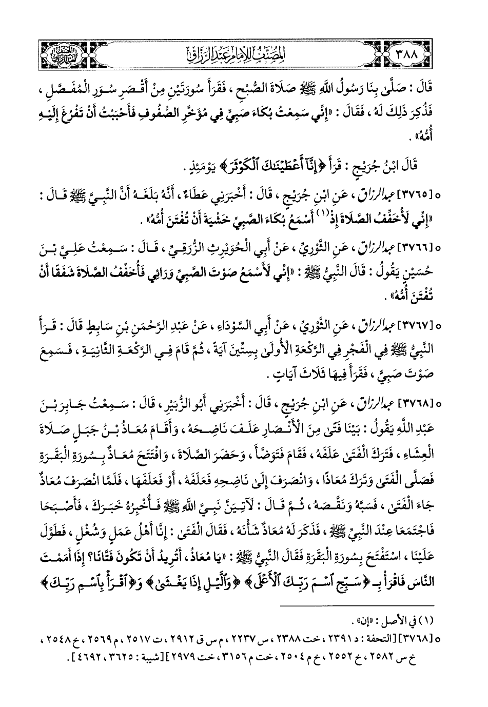 3767- عبد الرزاق، عَنِ الثَّورِيِّ، عَنْ أَبِي السَّوْدَاءِ، عَنْ عَبدِ الرَّحْمَنِ بْنِ سَابِطٍ، قَالَ: قَرَأَ النَّبِيُّ صَلَّى اللهُ عَلَيْهِ وَسَلَّمَ فِي الْفَجْرِ فِي الرَّكْعَةِ الأُولَى بِسِتِّينَ آيَةً، ثُمَّ قَامَ فِي الرَّكْعَةِ الثَّانِيَةِ، فَسَمِعَ صَوْتَ صَبِيٍّ، فَقَرَأَ فِيهَا ثَلاَثَ آيَاتٍ.